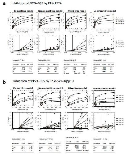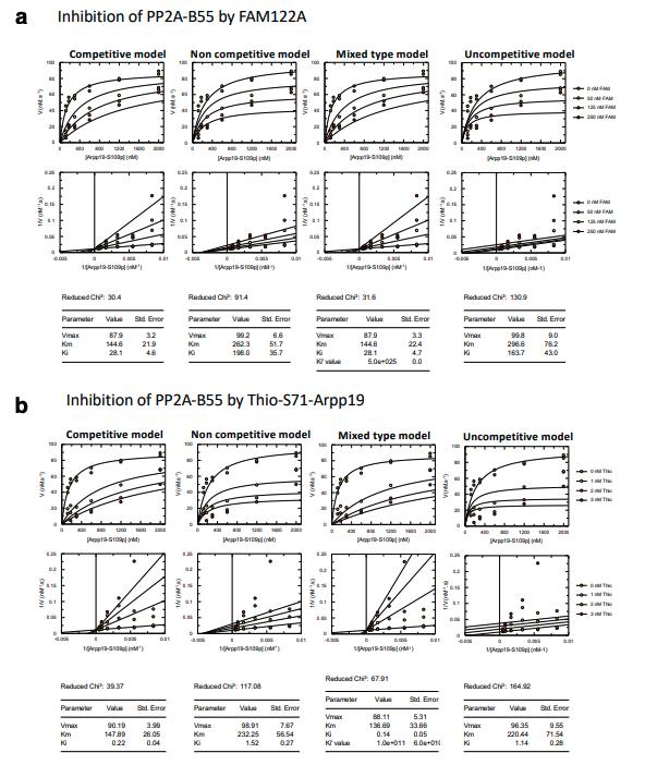 Appendix Figure S3, related to Fig 6. Determination of the mode of inhibition of PP2A-B55 by FAM122A and p-S71-Arpp19. (a) Inhibition of PP2A-B55 by FAM122A. The inhibition of PP2A-B55 by FAM122A was fitted using 4 different inhibition models: competitive of pS113-Arpp19, non-competitive, mixed or uncompetitive. Lineweaver-Burk representations, reduced Chi2 values and the fitting results are shown below each panel. (b) Inhibition of PP2A-B55 by Thio-S71-Arpp19 was fitted as for (a). |