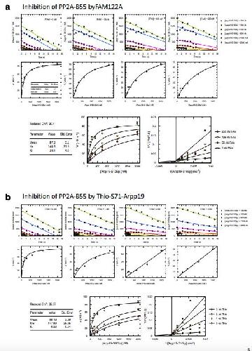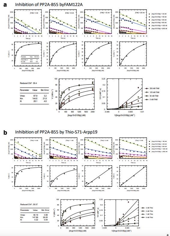 Appendix Figure S4, related to Fig6. Competitive inhibition of p-S113-Arpp19 by Fam122A and p-S71-Arpp19. (a) Top panels show the time courses for the dephosphorylation of p-S113-Arpp19 (concentrations indicated in the legend) by PP2A-B55 and with different concentrations of FAM122A (indicated on the graphs). Below are shown the hyperbolic fittings of the rate constants determined for each series individually. The lower panels show the global fitting of the 4 series according to a competitive model and the corresponding Lineweaver-Burk representation. (b) As for (a) except that the thio-S71-Arpp19 inhibitor was used. |