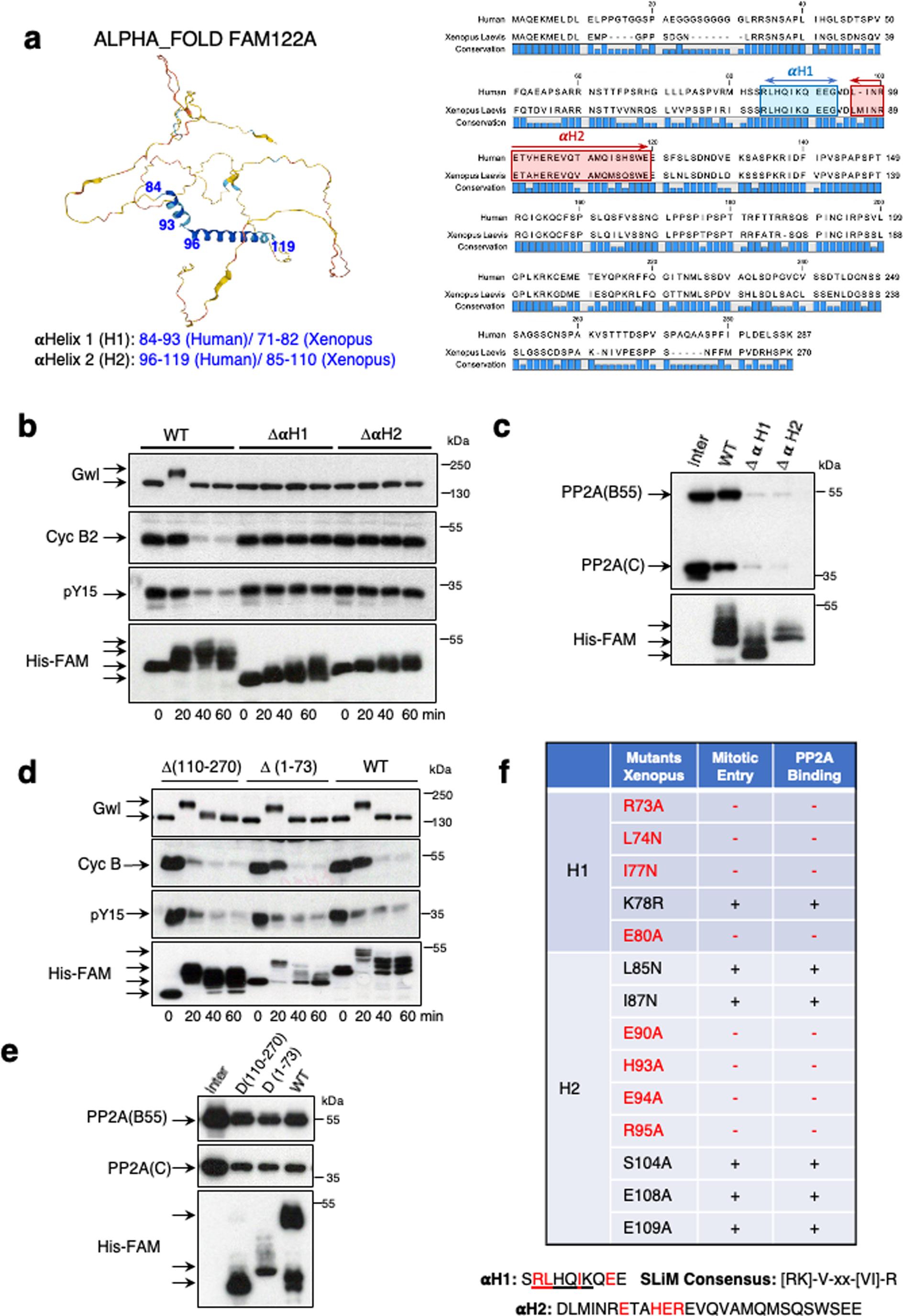 Figure 3. Molecular determinants controlling FAM122A inhibitory activity. (A) AlphaFold Monomer v2.0 predicts two structured αhelices (αHelix 1 and αHelix 2) in the human FAM122A protein and human. Xenopus laevis amino acid sequence alignment. αHelix 1 and αHelix 2 are indicated. (B) Interphase extracts were supplemented with the wildtype or the αH1 or αH2 mutants of Xe FAM122A and the phosphorylation and levels of the indicated proteins measured at the indicated times. (C) Interphase extracts supplemented with wildtype and αH1 or αH2 mutants were used for His-pulldown to measure the association of these proteins to B55 and C subunits of PP2A-B55. (D) The wildtype and the indicated mutant forms of Xe FAM122A were supplemented to interphase extracts and used for western blot. (E) His-pulldown was performed in extracts treated as in (D) to check the binding of the different forms of Xe FAM122A form to B55 and C. (F) Table indicating the capacity of the different single mutants of Xe FAM122A to induce mitotic entry and to bind to PP2A-B55. Mutants that have lost their inhibitory activity are depicted in red. The sequence of the αH1, the SLiM consensus sequence and the sequence of αH2 are shown. Residues essential to keep the inhibitory activity of Xe FAM122A are highlighted in red. Source data are available online for this figure. |
