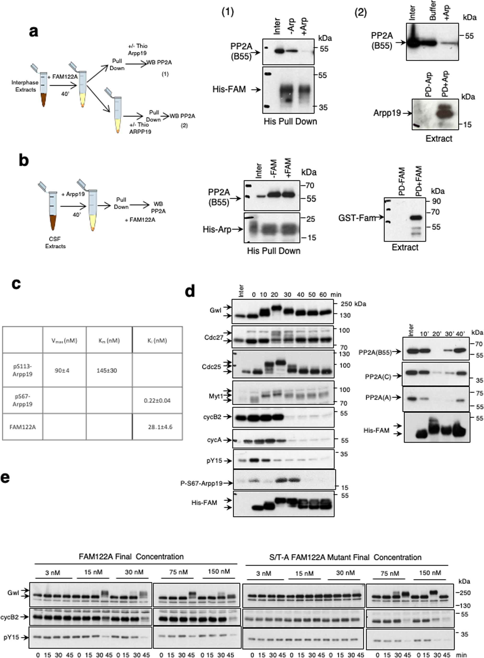 Figure 5. Arpp19 dissociates FAM122A from PP2A-B55 during mitosis. (A) Interphase extracts were supplemented with a final concentration of 7.15 μM of Xe FAM122A and 40 min later divided into two samples. One of these samples was used to perform a His-pulldown that was then supplemented with a final concentration of 2.7 μM of untagged Thio-Arpp19 protein and used to measure bound B55 protein. The second sample was firstly supplemented with untagged 69.3 pmol of Thio-Arpp19 and subsequently used for His-pulldown to measure His-Xe FAM122A bound B55 subunit of PP2A. A sample of the His-Xe FAM122A pull downs supplemented (PD+Arp) or not (PD-Arp) with untagged Thio-Arpp19 is shown. (B) CSF extracts were supplemented with a final concentration of 3,6 μM His-Arpp19 and, 40 min later, used for His-pulldown. Arpp19-pull downs were then supplemented with a final concentration of 10 μM GST-Xe FAM122A and the levels of B55 remaining were measured. A sample of the His-Arpp19 pull downs supplemented (PD + FAM) or not (PD-FAM) is shown. (C) Table indicating the kinetic parameters of the dephosphorylation of the PP2A-B55 substrate p-S113-Arpp19 and the inhibitory constant of FAM122A and Thio-S71-Arpp19 in kinase inactivated interphase extracts. Conditions used in these assays are detailed in Methods. (D) Interphase extracts were supplemented with His-Xe FAM122A and used for either western blot to measure the levels and the phosphorylation of the indicated proteins and or for His-pulldown determine Xe FAM122A binding to PP2A B55, A and C subunits at the indicated time points. (E) Interphase extracts were supplemented with His-FAM122A to the indicated final concentrations and mitotic entry was assessed by the phosphorylation of Gwl, dephosphorylation of tyrosine 15 of Cdk1 and the degradation of cyclin B2. Source data are available online for this figure. |