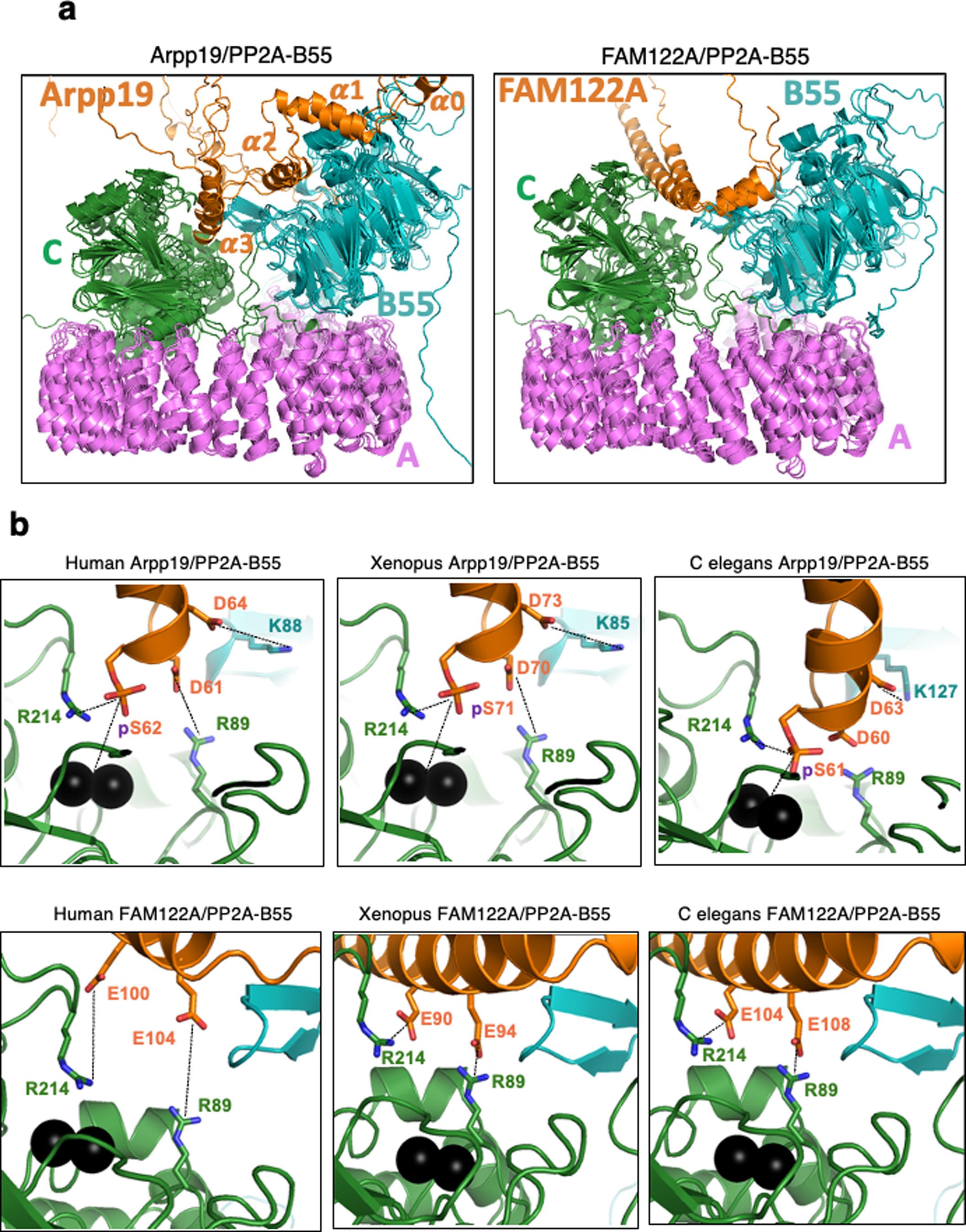 Figure 6. Arpp19 and FAM122A differently bind PP2A-B55. (A) Superposition of the models of Arpp19/ENSA and FAM122A in complex with ternary PP2A-B55 as predicted by Alphafold_multimer v 2.2 for three species (human, Xenopus and C. elegans). Arrp19/ENSA and truncated FAM122A are in orange ribbon while PP2A-B55 is in blue (B55), dark green (catalytic C subunit) and pink (the scaffold A subunit). (B) Zoom onto the entrance of the catalytic site of PP2A in complex with human Arpp19 and FAM122A. Manganese ions are shown as black spheres and sidechains are drawn as sticks with carbon colours as the corresponding polypeptide chains. Figure was drawn using Pymol (http://www.pymol.org). |