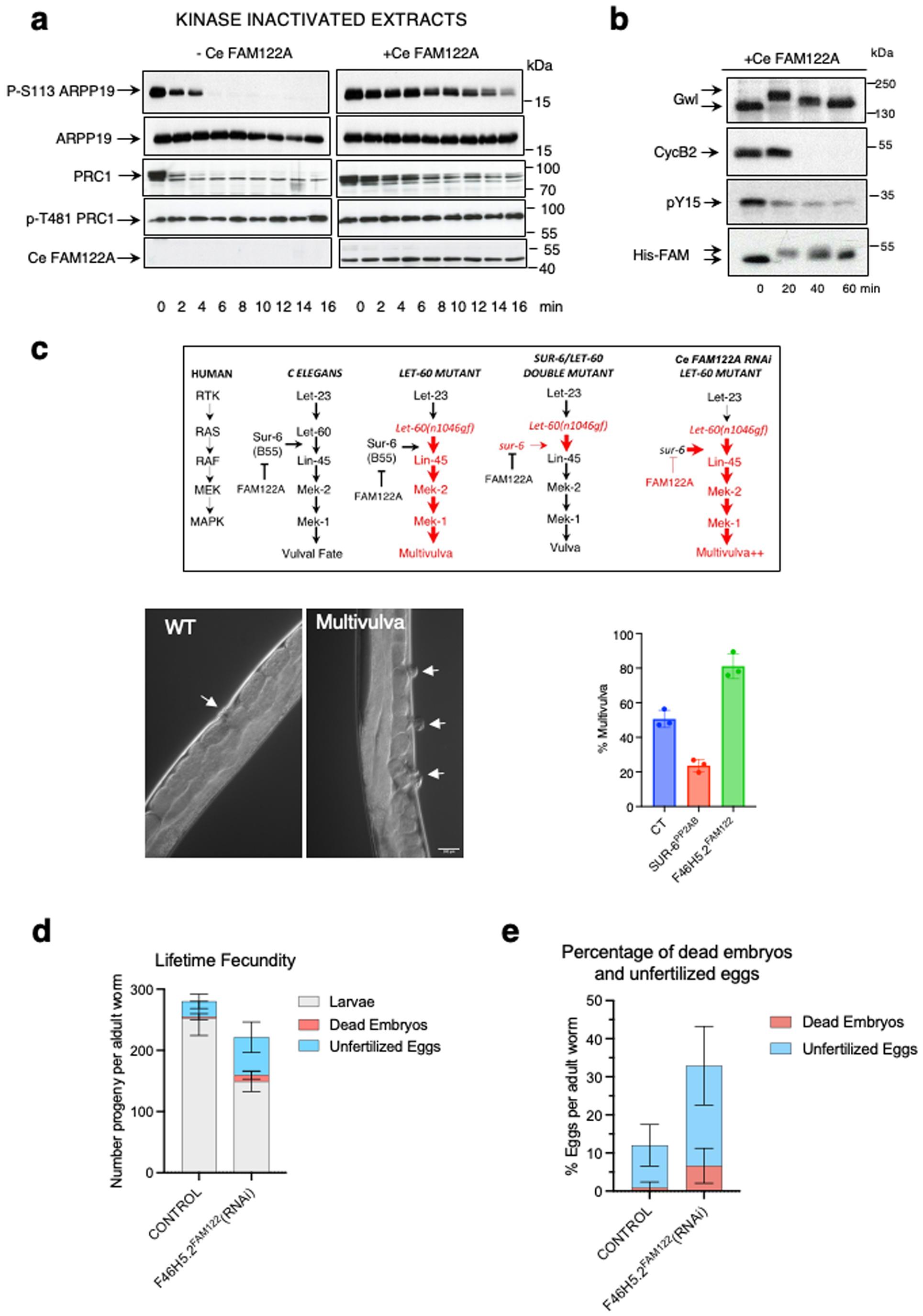 Figure 7. FAM122A is required to correctly enter into mitosis in C elegans. (A) Arpp19 or PRC1 “in vitro” phosphorylated by PKA or Cdk1 respectively were supplemented together with Ce FAM122A to interphase extracts and the levels and dephosphorylation rate of S113 of Arpp19 or T481 of PRC1, as well as the amount of Ce FAM122A, were analysed by western blot. (B) Ce FAM122A was added to interphase extracts and the levels and phosphorylation of the indicated proteins measured by western blot. (C) Scheme representing the genetic dependences of the gain of function let-60(gf) mutant and sur-6 (B55 orthologue) mutant on multivulva phenotype in C. elegans. sur-6 mutant (diminishes PP2A-B55 activity) on a let-60(gf) mutant background decreases the multivulva phenotype. Conversely, the depletion of F46H5.2 (FAM122A orthologue) in a let-60(gf) mutant background significantly increases this phenotype suggesting that, as expected, F46H5.2 protein would act as an inhibitor of PP2A-B55 in C. elegans. Big red arrows: increased multivulva phenotype. Shown are two representative images of a wildtype worm displaying one vulva or a mutant worm with a multivulva phenotype. The percentage of worms displaying multivulva phenotype in each mutant is represented as a mean +/− standard deviation. Significant differences calculated by non-parametric two tailed Mann-Whitney test are shown. (D) The number of larvae, dead embryos and unfertilized eggs were counted for control and F46H5.2(RNAi) worms and represented as mean values +/− standard deviation. (E) The percentage of dead embryos and unfertilized eggs were counted in worms at first day of adulthood and represented as for (D). Source data are available online for this figure. |