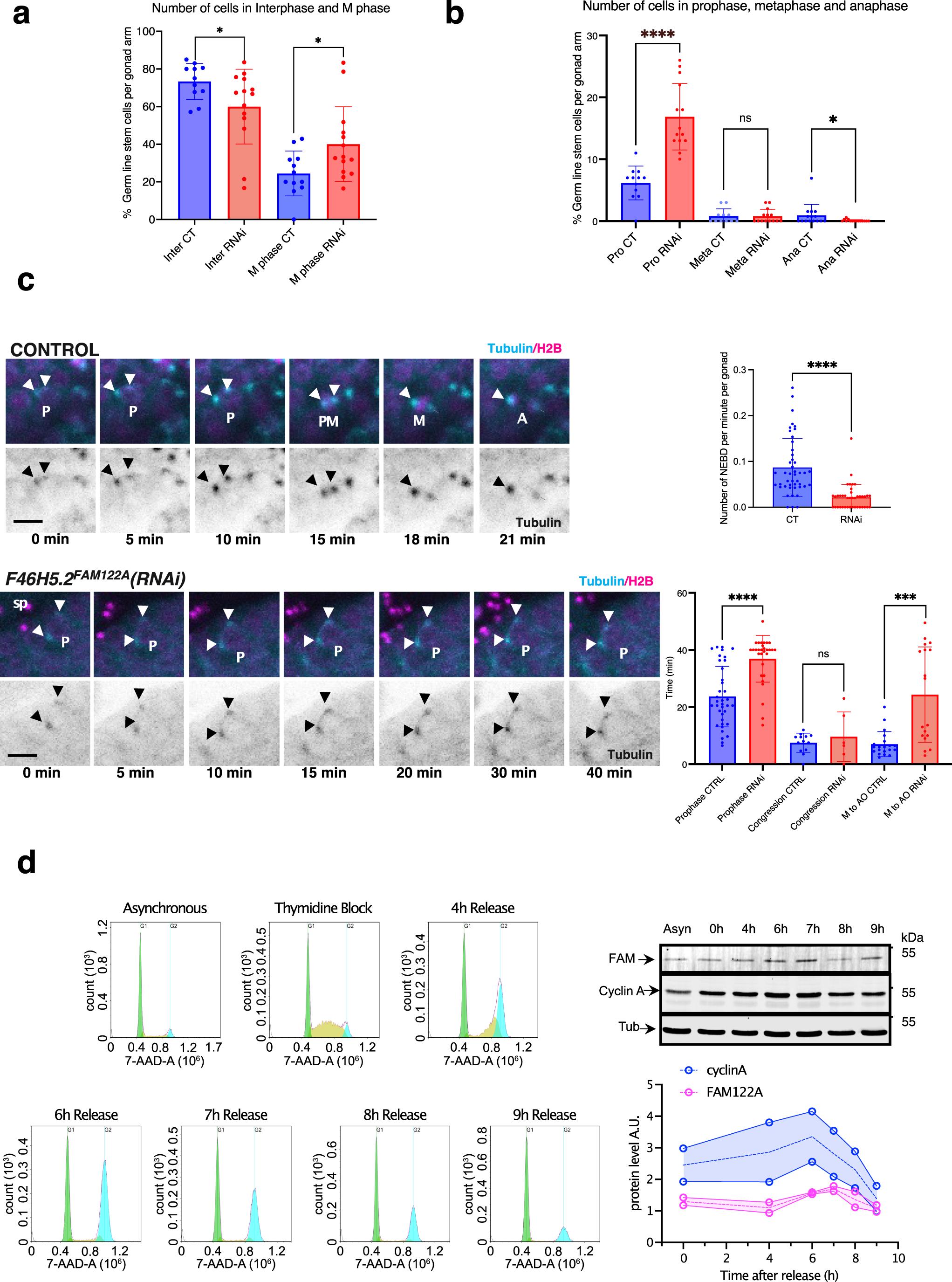 Figure 8. FAM122A is required “in vivo” in C. elegans to permit mitotic entry and progression in germ stem cells. (A) Nematode strains expressing histone and gamma-tubulin tagged with GFP were immobilised and immediately imaged by confocal microscopy for the quantification of interphase and mitotic cells as reported in the scheme of Appendix Fig. S6. Data are represented as mean ± standard deviation. (B) Prophase, metaphase and anaphase germ stem cells in gonads of worms were counted as in (A) and represented as mean ± standard deviation. (C) A GFP-tagged tubulin and with RFP-tagged histone nematode strain was followed by time lapse confocal microscopy and the timing of mitotic progression was determined in germ stem cells. Shown are representative images of stem cells performing mitotic division over time in control and RNAi treated worms. The number of cells performing nuclear envelope breakdown (NEBD) per minute and per gonad were counted and represented as the mean values ± standard deviation. Timing of cells to perform prophase (from first centrosome movement to nuclear envelope breakdown), congression (from nuclear envelope breakdown to metaphase plate) or anaphase onset were also recorded and represented as mean values ± standard deviation. Significant differences calculated by non-parametric two tailed Mann–Whitney test are shown. Arrowheads: centrosomes. P:prophase. Sp: Spermatozoids. PM: prometaphase. A: anaphase. Scale bar: 10 μm. *p < 0.01; ***p < 0.001; ****p < 0.0001. n ≥ 10. (D) RPE1 cells were (Thymidine Block) or not (Asynchronous) synchronized with thymidine treatment and released at the indicated timepoints. Released cells were used for western blot to measure FAM122A, cyclin A and tubulin levels at the different timepoints. Western blot signals were measured and FAM122A and cyclin A amounts were normalized and represented. n = 2. Source data are available online for this figure. |