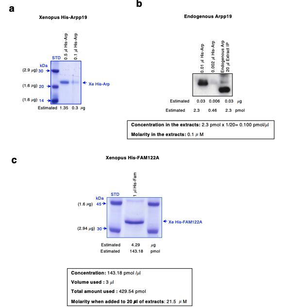 Appendix Figure S2, related to Fig.5 Estimation of final concentration in the extracts of endogenous Arpp19 and of the His-FAM122A used to induce mitotic entry. (a) The indicated volumes of the His-Arpp19 purified protein were used for PAGE-SDS and Coomassie blue staining. Intensity bands corresponding to His-Arpp19 were compared to standard markers and the protein amount quantified using ImageJ and estimated. (b) 20 µl of extracts were immunoprecipitated using anti-Arpp19 antibodies and submitted to western blot and the Arpp19 signal was compared with the one obtained for 0,03 and 0,006 µg of recombinant Xe-His-Arpp19. (c) Xenopus His-FAM122A concentration was estimated as for (a) and the final molarity corresponding to 1µl of His-FAM122A in 20 µl of extracts used for the experiments calculated. |