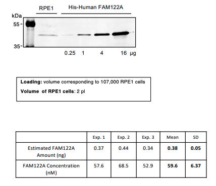 Appendix Figure S5, related to Fig.5. Estimation of the final concentration of endogenous FAM122A in RPE1 cells. (a) A volume corresponding to 107,000 RPE1 cells was loaded, together with 0.25, 1, 4 and 16 µg of His-Human FAM122A in a SDS-PAGE gel to perform western blot. Western blot signals were measured using ImageJ software and used to estimate endogenous FAM122A amount. FAM122A concentration was calculated by using a volume of 2 pl per RPE1 cell previously calculated in Cadart et al. (Cadart et al, 2018). Values of three different experiments were used to calculate a mean value ± standard deviation. |