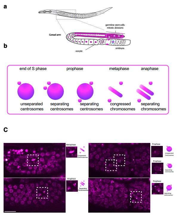 Appendix Figure S6, related to Figure 7-8. CeFAM122A depletion impairs mitotic entry of germ line stem cells in C. elegans nematodes. (a) Schematic representation of C. elegans nematode reproductive system. Germ line stem cells are located in the most distal part of each gonad arm. Chromatin is represented in magenta, microtubules in cyan (b) Schematic representation of the mitotic features observed and quantified based on chromatin and gamma-tubulin markers in Figure 8. (c) Representative images of the germ line stem cells imaged in TH32 strain (GFP-gamma-tubulin and GFP-histone) in Ce FAM122A depleted worms (right panel) or control worms (left panel). White dashed squares represent representative mitotic phases highlighted in zoomed square images next to each panel. |