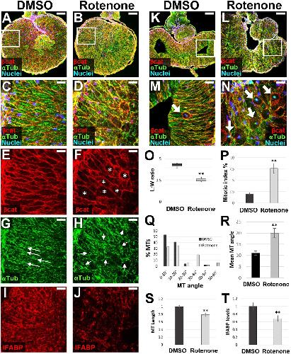 Fig. 6. Inhibiting mitochondrial ETC complex I by rotenone phenocopies ATR. (A-T) Transverse sections through the intestine of NF 42 (A-J) and NF 44 (K-N) DMSO control (A,C,E,G,I,K,M) and rotenone-exposed (B,D,F,H,J,L,N) embryos were immunostained for -catenin (red; A-F,K-N) to outline cell membranes and -tubulin (green; A-D,G,H,K-N) to visualize MT bundles. IFABP (red; I,J) was used as a marker of differentiated intestinal epithelia. Nuclei, blue (TO-PRO-3). Boxed region in A approximates the locations of C,E,G,I in neighboring sections; boxed region in B is shown at higher magnification in D,F,H, and approximates the location of J in a neighboring section. Note that the control image shown in A is reproduced from Fig. 2C. Boxed regions in K,L are shown at higher magnification in M,N, respectively. Compared with DMSO controls, the endoderm cells of rotenone-exposed intestines are rounder in shape (E,F, asterisks), as indicated by decreased L:W ratios of individual cells (O). They also exhibit abnormal polarity, indicated by disoriented and shorter MT bundles (G,H, arrows; quantified in Q-S). In addition, rotenone-exposed cells exhibit lower levels of IFABP (I,J,T), compared with DMSO controls. Finally, rotenone exposure increases the percentage of mitotically arrested cells at NF 44 (M,N, arrows); quantified by pHH3 staining (P). Error bars represent s.e.m. **P<0.01 (two-sample t-test). Scale bars: 100m (A,B,K,L); 25m (C-J,M,N). |