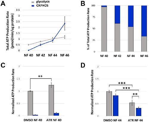 Fig. 7. A metabolic transition is required for intestine morphogenesis. (A,B) Glycolytic (gray) and mitochondrial (OXPHOS; blue) ATP production rates were measured in control embryos and represented as average levels of ATP production (A) and percent of total ATP production (B) by each pathway. (A) Glycolysis is the predominant pathway for energy production until NF 44, when mitochondria in differentiated epithelia begin to produce nearly equivalent levels of ATP. Subsequently (NF44+), OXPHOS becomes the predominant energy production pathway. (B) At early stages (NF 40), only 3% of ATP comes from mitochondrial processes; however, by NF 46 OXPHOS is the predominant source of ATP (67%). (C) Exposure to ATR increases the glycolytic ATP production rate at early stages (NF 40). (D) At later stages (NF 44), although chronic ATR exposure dampens the rate of energy production by both pathways, glycolysis remains the predominant source of energy in ATR-exposed embryos, producing ATP at almost twice the rate of OXPHOS. All results are from at least three independent experiments with 15-30 embryos each. Error bars represent s.e.m. **P<0.05, ***P<0.01 (one-way ANOVA with post-hoc Tukey's HSD). |