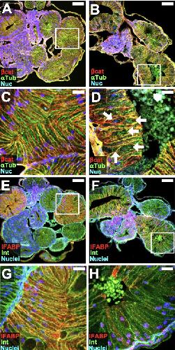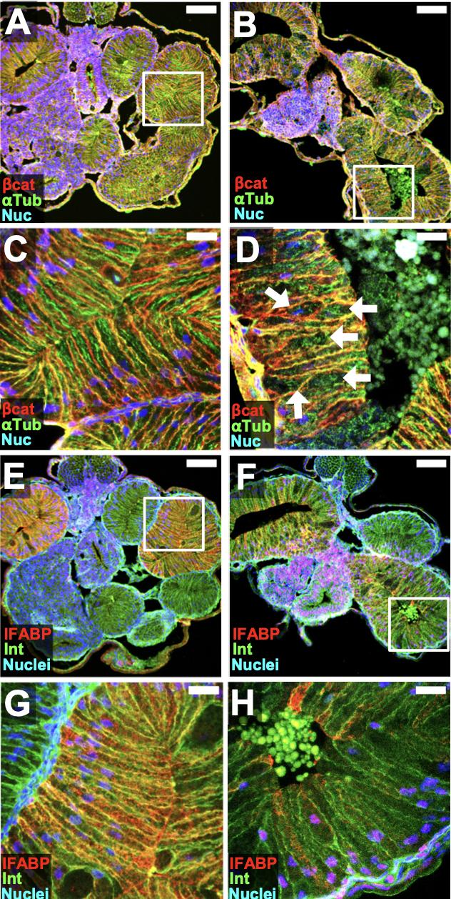 Fig. S3. ATR exposure causes late-stage abnormalities in epithelial architecture. Transverse sections of NF 44 embryos exposed to DMSO (A,C,E,G) or ATR (B,D,F,H) were immunostained for -catenin (cat, red; A-D), -Tubulin (Tub, green; A-D), integrin (Int, green; E-H, to outline cell membranes), and/or IFABP (red; E-H). Nuclei (Nuc, TO-PRO-3) are blue. Boxed regions in A-B and E-F are shown at higher magnification in C-D and G-H, respectively. Epithelial cells of ATR- exposed intestines appear disorganized, wider/rounder, and have aberrant apicobasal polarity (compare C and D, arrows). Robust IFABP expression is prevalent in control intestine loops at NF 44 (E,G), whereas expression is sparse in ATR-exposed intestines (F,H). Scale bars in A-B and E-F = 100 m. Scale bars in C-D and G-H = 25m |