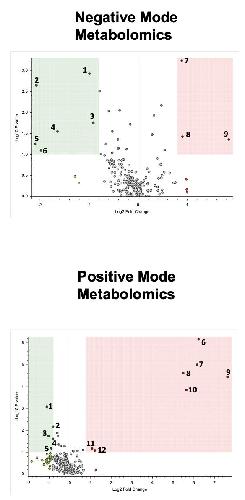 Fig. S5. Metabolite changes in intestines exposed to ATR. Volcano plots show the statistically-significant altered compounds (shaded area: p-value ≤ 0.1 and Log2 FC ≥ 0.8 or ≤ -0.8) in the ATR-treated group vs the DMSO-control group. Dots represent features that were downregulated (green), upregulated (red) or had no observed difference (gray). Data were filtered to remove features with Pooled QC Areas >30% RSD, Annotation ΔMass outside ±2 ppm and no MS2-based annotations. Corresponding tables list the significantly altered compounds annotated at confidence levels 1-3 as described by Schymanski et al (2014). Level 1 represents the highest confidence. [See supplementary file on Journal website for Tables associated with this supplementary figure]. |