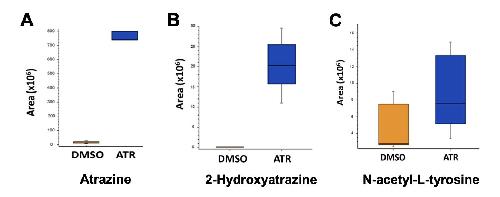 Fig. S6. Changes in select metabolites after ATR exposure. Metabolomic analysis of intestines exposed to DMSO or ATR revealed increased levels of atrazine (A), the ATR metabolite, 2-hydroxyatrazine (B), and N-acetyl-L-tyrosine (C), a metabolite associated with high ROS levels. P-value threshold: 0.05 and log2 fold change: 1. |