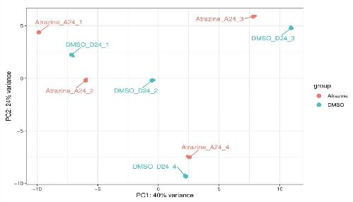 Fig. S8. Principal component analysis (PCA) of DMSO vs ATR RNAseq data. A PCA plot was generated to plot to assess sample outliers using the top 500 most variable genes after regularized log transformation. |