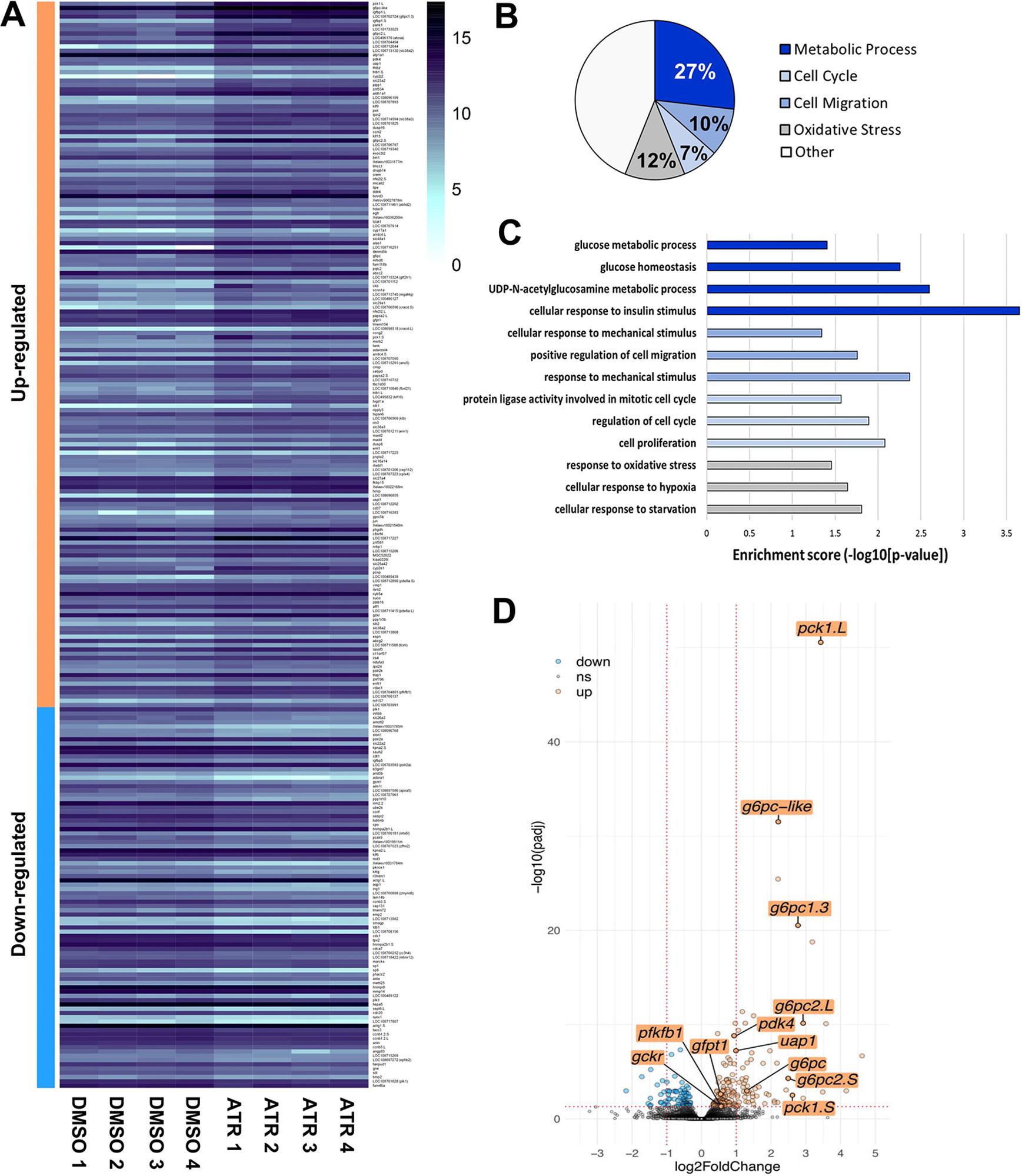 Fig. 4. ATR modulates metabolic gene expression. (A) Heat map of 254 X. laevis intestine transcripts significantly up- or downregulated by 24-h ATR exposure (P-adj<0.05; see Table S1). (B) Gene Ontology (GO) analyses indicate that 27% of GO terms were related to metabolic pathways (dark blue), 12% were related to oxidative stress (gray), 10% were involved in cell migration processes (medium blue) and 7% were related to regulation of the cell cycle (light blue). (C) Significance scores reveal enrichment of genes involved in stress responses, cell migration and mechanics, cell cycle regulation and proliferation, and glycolysis-related metabolic pathways. (D) Volcano plot of differentially regulated transcripts (log2-fold-change threshold=1, P-value threshold=0.05), highlights the upregulation of relevant glycolysis-related genes. Distinct copies of genes on the two Xenopus sub-genomes are designated as .L and .S. |