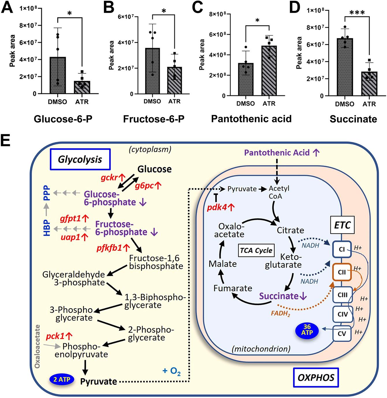 Fig. 5. ATR dysregulates central carbon metabolism in the intestine. (A-D) Metabolomic analysis of ATR-exposed guts (summarized in Fig. S5) reveals decreased levels of glucose-6-phosphate (Glucose-6-P; A), fructose-6-phosphate (Fructose-6-P; B) and succinate (D), compared with controls, whereas levels of pantothenic acid (C) increased. Error bars in A-D represent 95% confidence intervals. *P0.1, ***P<0.01 (Welchs t-test). (E) Diagram of central carbon metabolic pathways showing genes (red) and metabolites (purple) affected by exposure to ATR; up or down arrows next to each gene/metabolite name indicate whether levels were increased or decreased by ATR, respectively. Enzymes encoded by gckr and pfkfb1 regulate key steps of glycolysis; gfpt1 and uap1 control the flux of glucose into the hexosamine biosynthesis pathway (HBP); and g6pc genes and pck1 are key regulators of gluconeogenesis. In the presence of oxygen (O2), pyruvate crosses the mitochondrial membrane, regulated by the Pdk4 enzyme, which inhibits its conversion to acetyl-CoA and entry into the tricarboxylic acid (TCA) cycle. During a process known as oxidative phosphorylation (OXPHOS), reducing molecules generated by the TCA cycle (e.g. NADH, FADH2) enable a series of electron transport chain (ETC) complexes (CI-CIV) to build electron (H+) potential across the inner mitochondrial membrane. This potential is ultimately used by the last complex, ATP synthase (CV), to generate substantially more ATP (net 36 mols) from the original glucose than glycolysis alone. PPP, pentose phosphate pathway. |