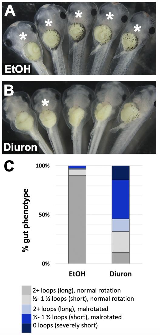 Fig. S1. Exposure to Diuron causes intestinal shortening and malrotation. (A) EtOH controls develop elongated intestines that are normally rotated (indicated by *), while Diuron-exposed embryos develop intestines that are predominantly short and/or malrotated (B), identical to the phenotypes seen after ATR exposure. Similar to ATR, Diuron elicits varying degrees of phenotypic severity, with short and malrotated being the most prominent (C; royal blue portion of bar). All results shown are from at least three independent experiments with 15-20 embryos each. |