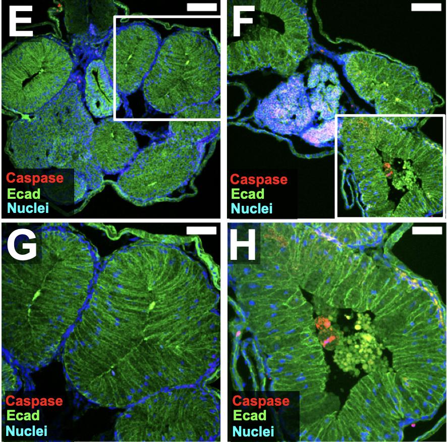 Fig. S4. ATR increases mitosis and apoptosis. [panels E-H] Transverse sections through the intestine of NF 44 DMSO control and ATR-exposed embryos were immunostained for E- cadherin (Ecad, green; A-H) to visualize cell membranes, phosphohistone-H3 (pHH3, red; A-D) to identify mitotic cells, and caspase-3 to identify apoptotic cells (red; E-H). Boxed regions in A-B and E-F are shown at higher magnification in C-D and G-H, respectively. ATR-exposed intestines have a greater number of mitotic cells at the apical surface of the epithelium (compare C and D, arrows). Compared to controls (E, G) ATR-exposed intestines also have apoptotic cell debris within the lumen (F, H), as indicated by caspase staining (quantified in I). Nuclei are blue (TO-PRO-3). Error bars represent SE. *p<0.05. Scale bars in A-B and E-F = 100 m. Scale bars in C-D = 25 m. Scale bars in G-H = 50 m. |