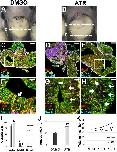 Fig. 2. ATR inhibits endoderm cell properties required for early intestine elongation. (A-Q) Transverse sections through the intestine of NF 42 control (DMSO; A,C,E,G,I,K) and ATR-exposed (B,D,F,H,J,L) embryos were immunostained for Beta-catenin (red; C-H) to outline cell membranes, alpha-tubulin (green; C-F,I,J) to visualize MT bundles, and IFABP (red; K,L) to mark differentiated intestinal epithelial cells. Nuclei (TO-PRO-3) are blue. Dashed lines in A,B indicate the approximate location of DMSO and ATR sections. Boxed regions in C and D are shown at higher magnification in E,G,I and F,H,J, respectively, and approximate the locations of K and L, respectively, in neighboring sections. Note that the control image shown in C is the same as that displayed in Fig. 6A. Cells of ATR-exposed intestines are rounder in shape (G,H, asterisks), as indicated by decreased L:W ratios of individual cells (M), and have short (N), misoriented MT bundles (I,J, arrows; quantified in O,P) and low levels of IFABP (K,L,Q), compared with DMSO controls. Error bars represent s.e.m. **P<0.01 (two-sample t-test). Scale bars: 100um (C,D); 25um (E-L). |
