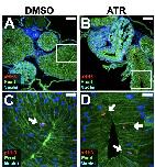 Fig. S7. Antioxidant pretreatment rescues ATR-induced intestinal elongation and rotation defects. B) Pretreating embryos with an antioxidant (NAC; B) does not affect the normal gut morphology (indicated by *) of DMSO controls (A). However, the elongation and rotation defects caused by ATR (C) are partially rescued by NAC pretreatment (D; p<0.01). A rescue was scored if guts exhibited 2+ intestinal coils with normal (CCW) rotation. Results were replicated in at least three independent experiments with 8-15 embryos each. |