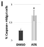 Fig. S4. ATR increases mitosis and apoptosis.[panels A-D] Transverse sections through the intestine of NF 44 DMSO control and ATR-exposed embryos were immunostained for E- cadherin (Ecad, green; A-H) to visualize cell membranes, phosphohistone-H3 (pHH3, red; A-D) to identify mitotic cells, and caspase-3 to identify apoptotic cells (red; E-H). Boxed regions in A-B and E-F are shown at higher magnification in C-D and G-H, respectively. ATR-exposed intestines have a greater number of mitotic cells at the apical surface of the epithelium (compare C and D, arrows). Compared to controls (E, G) ATR-exposed intestines also have apoptotic cell debris within the lumen (F, H), as indicated by caspase staining (quantified in I). Nuclei are blue (TO-PRO-3). Error bars represent SE. *p<0.05. Scale bars in A-B and E-F = 100 μm. Scale bars in C-D = 25 μm. Scale bars in G-H = 50 μm. |