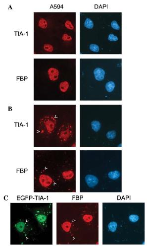 immunostained with anti-FBP (A) or anti-TIA-1 (B,C) antibodies, and analyzed by confocal microscopy. The EGFP-fusion proteins appear in green and