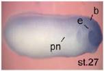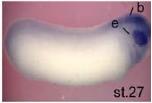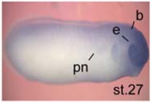 tia1 (TIA1 cytotoxic granule-associated RNA binding protein) gene expression in Xenopus laevis embryo, assayed via in situ hybridization, NF stage 27, lateral view, anterior right, dorsal up. |