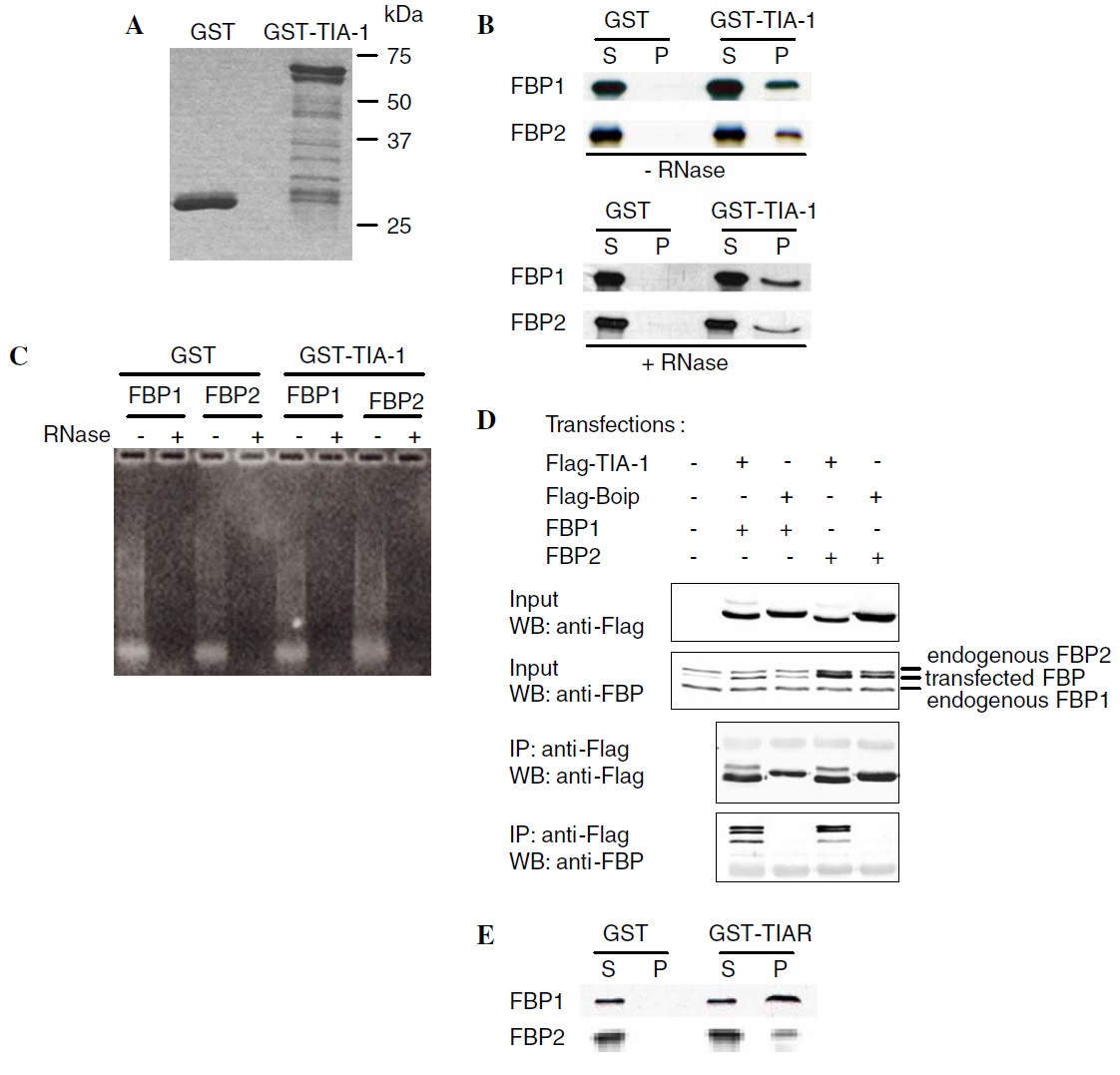 expressing flag-TIA-1 or flag-Boip (control) in combination with FBP1- or FBP2-expressing constructs. Cells were lysed and flag-tagged proteins were