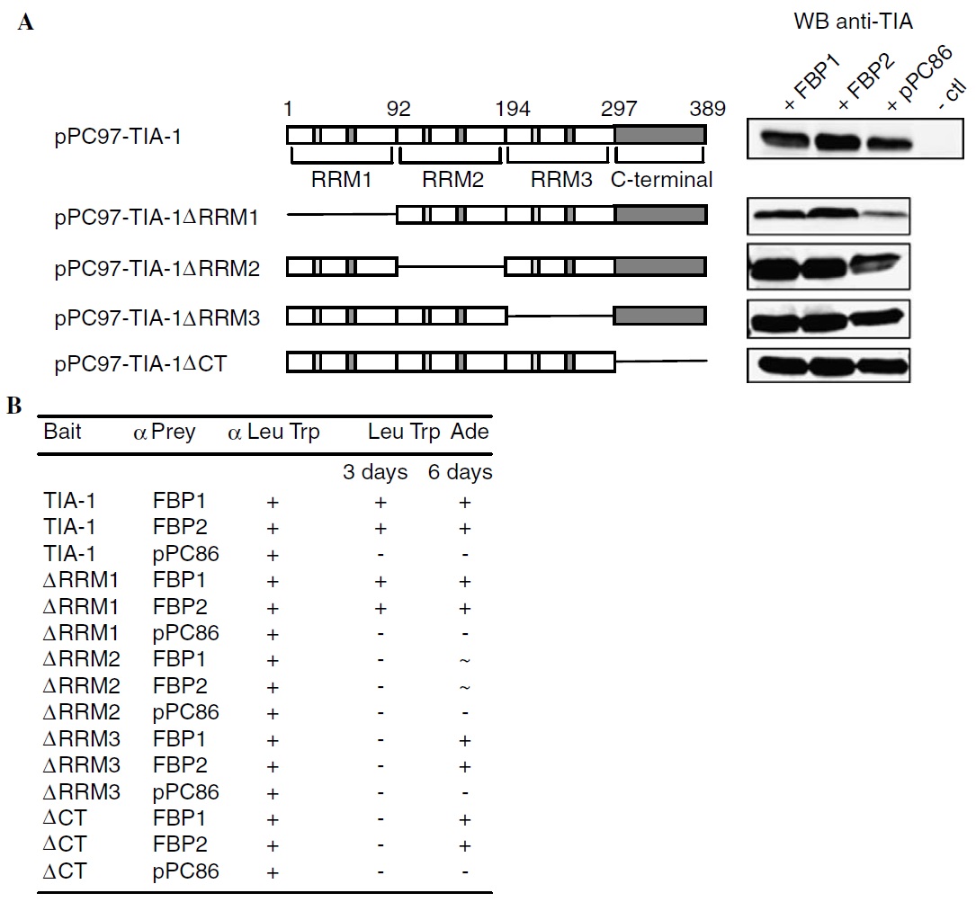 (prey) together with pPC86 vector, pPC86-FBP1 or pPC86-FBP2 (bait). The expression of TIA-1 and the deletion mutants was verified by Western blot