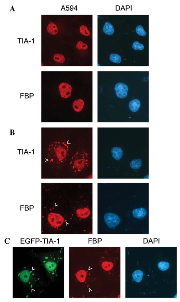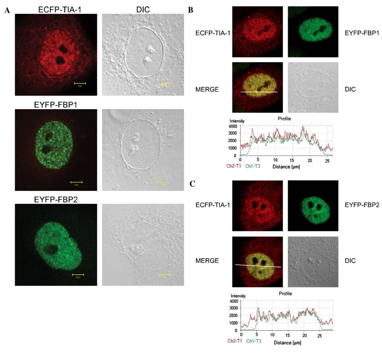 transfected with pECFP-TIA-1 (A), pEYFP-FBP1 (B), and pEYFP-FBP2 (C) constructs. Twenty-four hours after transfection, the cells were fixed,