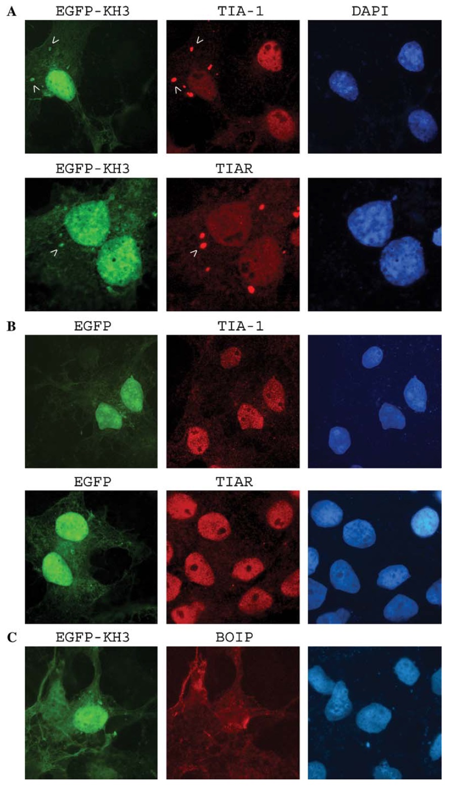 TIA-1 and TIAR; right panels: DAPI staining. (C) Localization of Boip in Cos cells transfected with pEGFP-C2-FBP2-KH3. Left panel, EGFP; middle