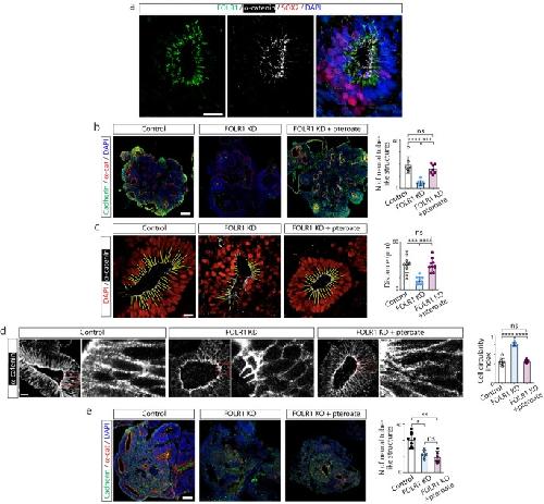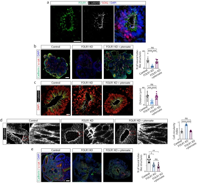 Fig. 3: FOLR1 enables cadherin enrichment in apicolateral neural cells surrounding the lumen of neural tube-like structures in hiPSC-derived neural organoids by a non-metabolic mechanism. a hiPSC-derived embryoid bodies were incubated with 2M control-vivo-morpholino (Control), FOLR1-vivo morpholino (FOLR1 knockdown (KD), FOLR1-MO) or FOLR1-MO and 50M pteroate (FOLR1 KD + pteroate) until 1821 days in vitro when neural organoids were fixed and processed for immunostaining and nuclear labeling with DAPI. b Cultured hiPSCs reaching 75% confluency were transfected with FOLR1-sgRNA/CRISPR/Cas9 (FOLR1 KO) and used for neural organoid cultures. Cultures were supplemented with vehicle (Control) or 50M pteroate (FOLR1 KO + pteroate) until 1821 days in vitro when neural organoids were fixed and processed for immunostaining and nuclear labeling with DAPI. a, b Images are examples of immunostained neural tube-like structures. Graphs show individual and meanSD maximum percent change in cadherin immunolabeling fluorescence intensity when crossing the lumen per neural tube-like structure, n=9 (a) and n=12 (b) neural organoids per group, N=3 independent experiments. **p<0.01, ****p<0.0001, ns not significant, one-way ANOVA, Tukey post-hoc multiple comparison test. Scale bars are 20m. Source data are provided as a Source Data file. |