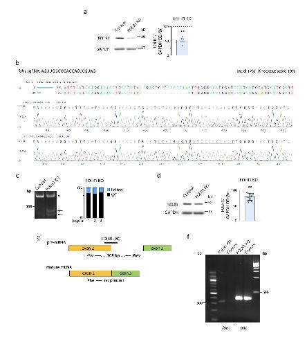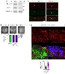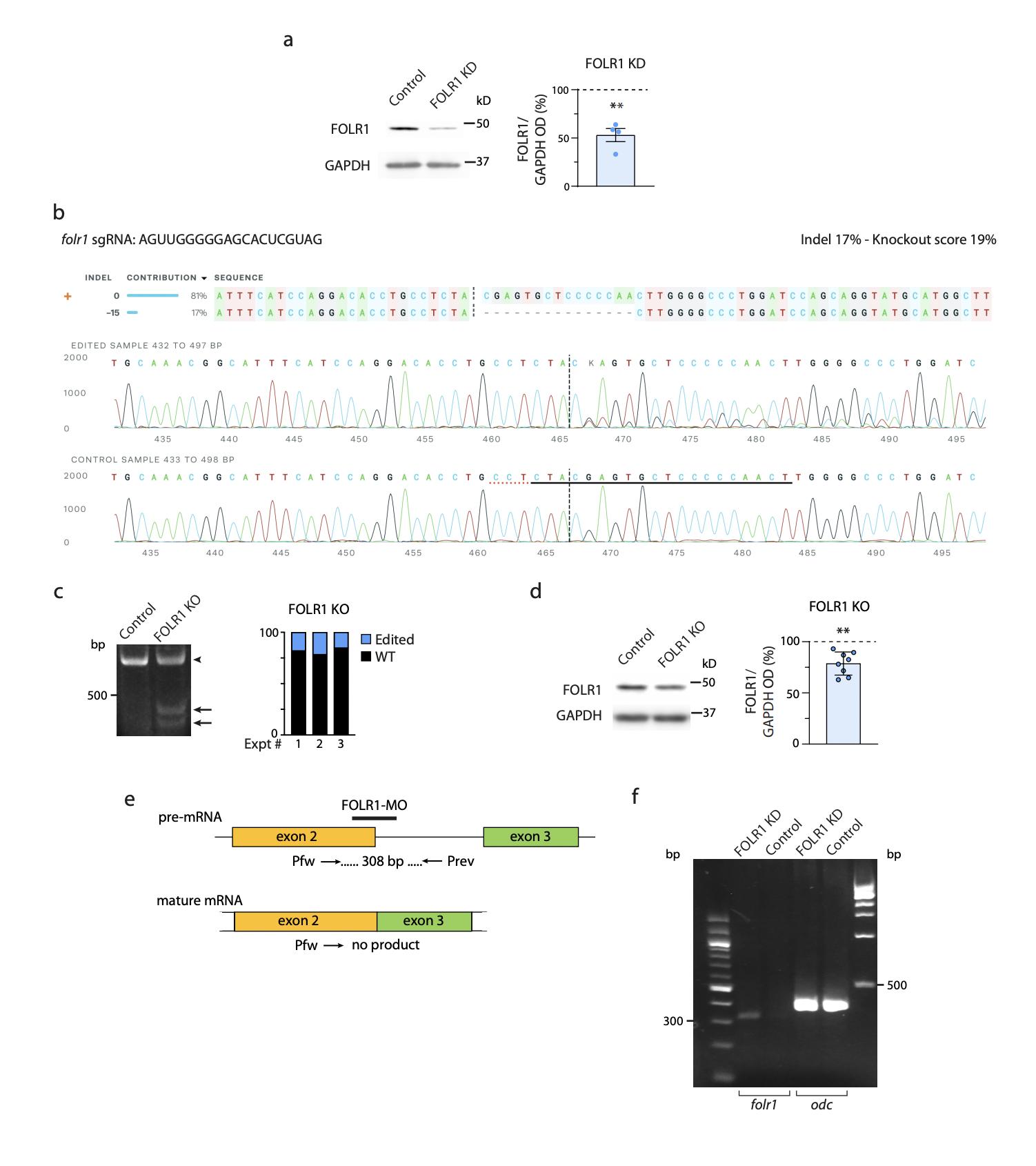 Supplementary Fig. 1. Folate receptor 1 knockdown and knockout in hiPSCs and Xenopus laevis embryos. a, hiPSCs at 70% confluency were incubated with 2 µM FOLR1-vivo morpholino (FOLR1-MO, FOLR1 KD) or Control-vivo MO (Control) for 48 h, when collected and processed for Western blot assays. Image is an example of a Western blot assay. Graph shows individual and mean±SD percent of optical density (OD) for FOLR1 protein band normalized with GAPDH and compared to Control (100%, dashed line), **p<0.01, one-sample t and Wilcoxon test. b-d, 60% confluent hiPSCs from 1 well of a 6-well plate were incubated with 1.2 µg FOLR1-targeted gRNA, 6.25 µg Cas9 and lipofectamine CRISPR transfection reagent for 48 h. Four-day old cells were then processed for sequencing, ICE knockout analysis (b), detection of genomic cleavage (c) and FOLR1 protein level (d). b, Experimental assessment of CRISPR/Cas9-mediated FOLR1 gene deletion by ICE knockout analysis. The Cas9 cleavage site is indicated in vertical dashed line. Top, wild-type sequence is marked by + (left, 0). Bottom, Sanger sequencing chromatograms showing edited and control sequences around the region of the guide sequence (horizontal black line). PAM site: dotted red line. c, Example of gel showing genomic DNA from control and transfected hiPSCs processed to detect cleavage by CRISPR/Cas9 (lower size bands). Graph shows the proportion of FOLR1 edited cells in transfected hiPSCs in N=3 experiments, exhibiting a 20% FOLR1 KO. d, FOLR1 gRNA/CRISPR/Cas9 transfected (FOLR1 KO) and control hiPSCs at 70% confluency were collected and processed for Western blot assays. Image is an example of Western blot assay. Graph shows individual and mean±SD percent of optical density (OD) for FOLR1 protein band normalized with GAPDH and compared to Control (100%, dashed line), **p<0.01, one-sample t and Wilcoxon test. e, Schematic of FOLR1 splicing morpholino design against Xenopus laevis folr1 mRNA. Forward (fw) and reverse (rev) primers (P) used to detect aberrantly spliced mRNA and expected PCR products are indicated under each pre- and mature-mRNA drawings. f, mRNA was extracted from neural plate stage control-MO (Control) and FOLR1-MO (FOLR1 KD) injected Xenopus laevis embryos and processed for RT-PCR with primers indicated in e. Shown is example of PCR product gel with ODC as positive control. Three independent experiments showed similar results. |