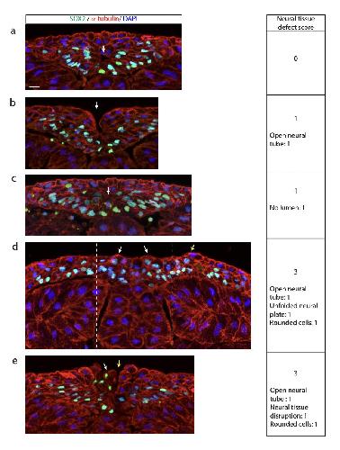 Supplementary Fig. 3. Scoring of neural tissue defects in Xenopus laevis embryos. Control and experimental Xenopus laevis embryos were allowed to develop until controls reached early neural tube stages (stage 21), when they were fixed and processed for immunostaining. a-e, Images are examples of immunostained and nuclei-labeled transverse sections. Characteristics of defects and scores are listed on the right. Scale bar, 20 µm. White arrows indicate lumen (a), open neural tube (b), absence of lumen (c), rounded and loosely attached neural cells (d and e). Yellow arrows indicate neural fold (d) and neural tissue disruption (e). Dashed lines in (d) were traced as perpendicular to the dorsal plane and tangent to the lateral borders of the notochord and used to identify the lack of neural plate folding when neural folds do not fall in between these lines. Text to the right of images indicates the score of neural tissue defects and type of defects identified in each shown example. |
