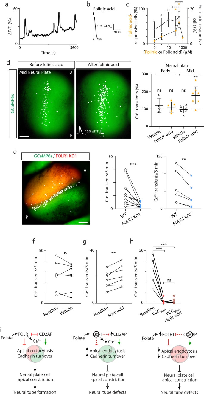 Fig. 9: Folate-FOLR1 contribute to Ca2+ dynamics in neural plate cells during neural plate folding. ac Neural plate from mid neural plate stage Xenopus laevis embryos was dissected and dissociated cells plated in vitro. After 2h, cells were loaded with the Ca2+ sensor Fluo4-AM and time-lapse imaged. a Example of 1-h recording of neural plate cell Ca2+ activity. b, c Folinic acid (b, c), folic acid (c) or vehicle was added to neural plate cells in culture during time-lapse imaging and the Ca2+ response was recorded in the first minute post addition. b Example of acute transient elicited by 100M folinic acid. c Graph shows meanSEM folinic- or folic acid-responsive neural plate cells compared to total number of cells with spontaneous Ca2+ transients in 30min recording, N=3 independent experiments. Two-tailed one sample t and Wilcoxon test. d Two-cell stage embryos were bilaterally microinjected with GCaMP6s mRNA and grown until early and mid-neural plate stages when they were time-lapse imaged before and after addition of vehicle or 300M folinic acid. Image shows example of embryo with cells exhibiting Ca2+ transients indicated with circles. Graph shows individual and meanSD percent change in Ca2+ transient frequency before and after addition of vehicle or folinic acid, n=4, 5, 6 and 7 embryos for Early-Vehicle, Early-Folinic acid, Mid-Vehicle and Mid-Folinic acid groups, respectively. One-sample two-tailed t-test, compared to hypothetical value of 100%. eh Two-cell stage embryos were bilaterally microinjected with GCaMP6s mRNA (eh) and unilaterally microinjected with 9.9pmol FOLR1-MO1 (FOLR1 KD1/KD) or 1.6pmol FOLR1-MO2 (FOLR1 KD2) per blastomere (e) and grown until mid-neural plate stages when they were time-lapse imaged. Image in (e) shows example of embryo with cells exhibiting Ca2+ transients indicated with circles in WT and FOLR1 KD1 halves. Graphs show individual Ca2+ transient frequency (transients/5min) in WT and FOLR1 KD1 or KD2 halves (e, n=6 embryos) and in WT embryos before and after addition of vehicle (f, n=7 embryos), 50M folic acid (g, n=6 embryos), Na+ and voltage-gated Ca2+ channel blockers (VGCblock: 0.02% tricaine+10M nitrendipine+25M TTA-2, h, n=5 embryos), or a mix of folic acid and VGCblock (h, n=5 embryos). Two-tailed paired t-test (eg) and 1-way ANOVA-Tukey multiple comparisons test (h). In (ch), *p<0.05, **p<0.01, ***p<0.001, ****p<0.0001, ns: not significant. i Model of FOLR1 and CD2AP regulation of neural tube formation. Source data are provided as a Source Data file. |
