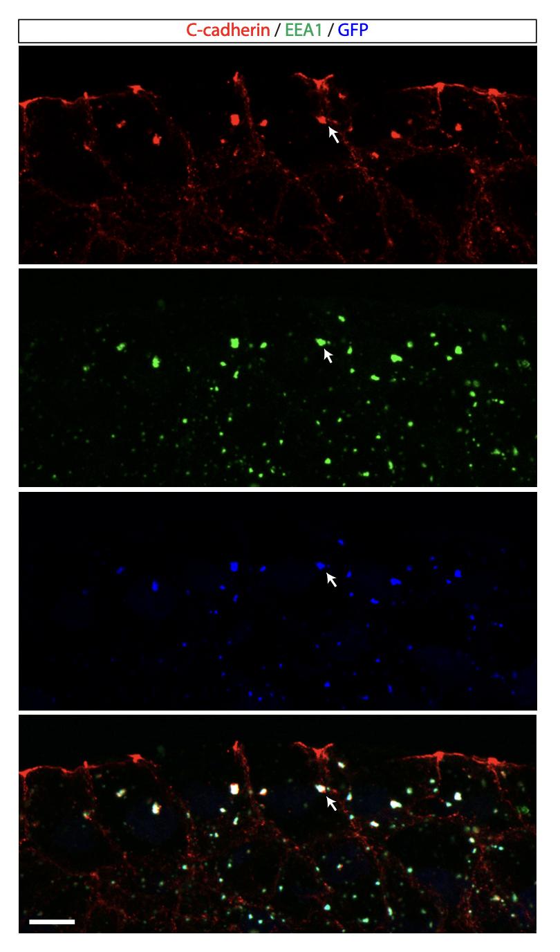 Supplementary Fig. 5. Exogenously expressed endocytosis reporter hEEA1-GFP colocalizes with endogenously-expressed C-cadherin in early endosomes. Two-cell stage Xenopus laevis embryos were bilaterally microinjected with hEEA1-GFP mRNA and allowed to develop until they reached early neural plate stages (stage 14-14.5), when they were fixed and processed for immunostaining. Image is a transverse section of the neural plate immunostained for C-cadherin, EEA1 and GFP. Arrow indicates colocalization of C-cadherin, EEA1 and GFP. Scale bar, 10 µm. Similar results were observed in N=3 independent experiments. |