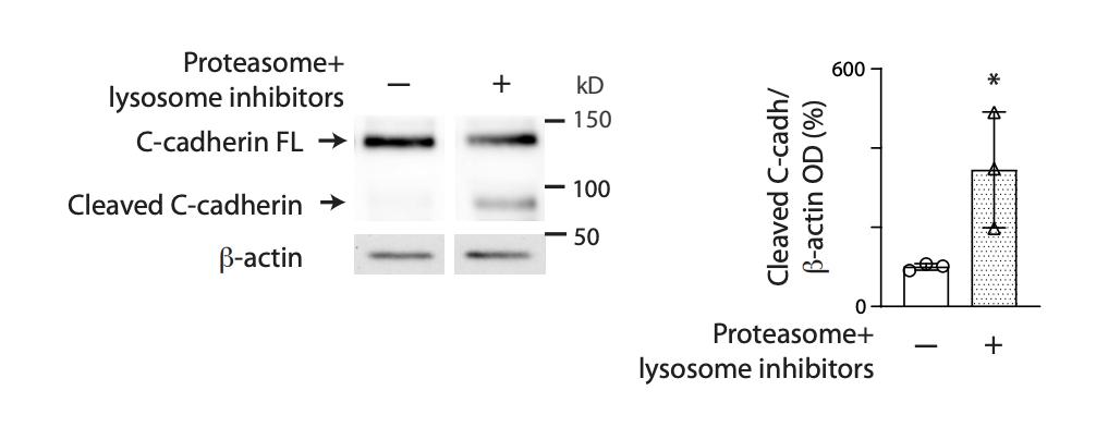 Supplementary Fig. 6. Inhibition of protein degradation in neurulating Xenopus laevis embryos results in accumulation of C-cadherin N-terminal fragment in neural plate. Early neural plate stage (stage 13) embryos were incubated with lysosome and proteasome inhibitors or vehicle for 4-5 h until they reached mid-neural plate stages (stage 16-17) when neural plate was dissected and processed for Western blot assays. Example of Western blot assay immunoprobed for C-cadherin showing full-length and cleaved (~80 kD) forms. Graph shows individual and mean±SD percent of optical density (OD) for C-cadherin cleaved fragment normalized with β-actin protein band OD and compared to controls (100%, dashed line), *p<0.05, two-tailed ratio t-test, n=10 neural plates per group, N=3 independent experiments. |