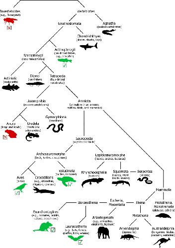 Fig. 1. Cladogram depicting the study of spontaneous retinal waves across species. A green silhouette and check indicates retinal waves have been observed in this phylogenetic group. A red silhouette and cross indicates that observations have failed to detect retinal waves in this group. To our knowledge, retinal waves have not been studied in any taxonomic group besides those indicated here.