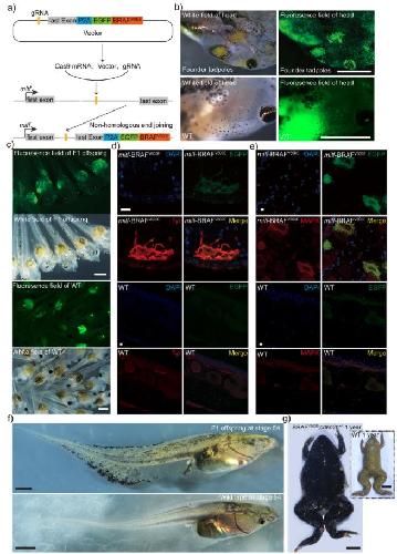 Fig. 6: The integration of the BRAFT1799A within the mitf locus elicits spontaneously formed melanophores-related nevi and xanthophores-like moles in Xenopus tropicalis. a The strategy of precisely integrating the human BRAFT1799A mutation into the mitf genomic locus through non-homologous end joining repair mediated by CRISPR/Cas9 has been demonstrated. This involves placing the mutation downstream of the last exon of mitf, thereby utilizing the endogenous promoter of mitf to drive BRAFV600E expression. b At stage 56, following precise integration of human BRAFT1799A into the mitf genomic locus, the founder generation tadpoles exhibited a mosaic phenotype characterized by aberrant proliferation of melanophores and xanthophores. Additionally, a significant proliferation of xanthophores was observed using spontaneous green fluorescence. The control group exhibited the absence of this phenotype in WT tadpoles. A total of eight such tadpoles were observed at this stage. c Compared to the control group of WT tadpoles, the F1 generation mitf-BRAFV600E tadpoles at stage 46 were observed and found to exhibit EGFP signals. d, e Immunofluorescence analysis was performed on three tail samples obtained from three stage 56 mitf-BRAFV600E tadpoles from the F1 generation. Every sample was fixed, embedded, and sectioned into six paraffin slices for the analysis. The results demonstrated co-localization of Tyr and EGFP (d), as well as co-localization of EGFP and MAPK signaling pathway activation (e). The WT control group showed an absence of EGFP signals, and cells with activated MAPK pathway were also scarce. The activation of the MAPK signaling pathway was evidenced by positive fluorescence signal of the antibody-ERK1 + ERK2. The images presented here were representative of the observed results. f A typical photograph of F1 mitf-BRAFV600E tadpoles at stage 54 and the corresponding batch of WT tadpoles was presented. g Compared to a 1-year-old WT frog, a representative image of a 1-year-old cdkn2b+/−;mitf-BRAFV600E frog showed spontaneously formed nevi and xanthophoromas. Scale bar in b, 2 mm; Scale bar in c, 1 mm; Scale bar in d and e, 10 μm; Scale bar in f, 5 mm; Scale bar in g, 1 cm. |