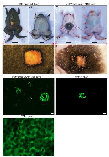 Fig. 9: Allogeneic transplantations of xanthophoromas were conducted in mitf−/−/prkdc−/−/il2rg−/− Xenopus tropicalis, resulting in the observed systemic metastasis of transplanted xanthophoromas in the recipient animals. a At 150 days post-transplantation, xanthophoromas were observed intravitally in both dorsal skin (DS) and ventral skin (VS), and the enlarged views of transplanted xanthophoromas in ellipses 1 and 2 were depicted in 3 and 4, respectively. Xanthophoromas from eight stage 58 cdkn2b−/−;mitf-BRAFV600E tadpoles were transplanted onto the dorsal skin of four WT frogs and four mitf−/−/prkdc−/−/il2rg−/− frogs, which served as the transplant recipients. The transplants were monitored for up to one year. The presented data represented representative results on day 150 post-transplantation, and additional representative observation data are provided in Supplementary Fig. 28. b Metastasized xanthophoroma cells were intravitally observed under fluorescence field conditions in the right thigh of the recipient depicted in panel a. To provide a representative control, intravital observations were also conducted on the right thigh of three 1-year-old mitf−/− frogs that had not undergone xanthophoroma transplantation, using fluorescence field conditions. Control group WT exhibits spontaneous green fluorescence on the dorsal skin of one-year-old Xenopus tropicalis. The scale bar in a is 1 cm. The scale bar in b is 10 μm. |