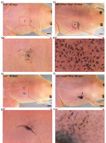 Fig. 10: Allogeneic transplantations of melanomas were conducted in mitf−/−/prkdc−/−/il2rg−/− Xenopus tropicalis, resulting in the observed migrations of transplanted melanomas in the recipient animals. a–h At day 40 post-transplantation, the transplanted nevi and metastatic melanoma were examined in mitf−/− (a, c, e, g) and mitf−/−/prkdc−/−/il2rg−/− (b, d, f, h) recipients. The enlarged views of the transplanted nevi and metastatic melanoma were portrayed in panels c and d (red dashed boxes 1 and 2) and g and h (red dashed boxes 3 and 4), respectively. Each scale bar is 1 mm. |