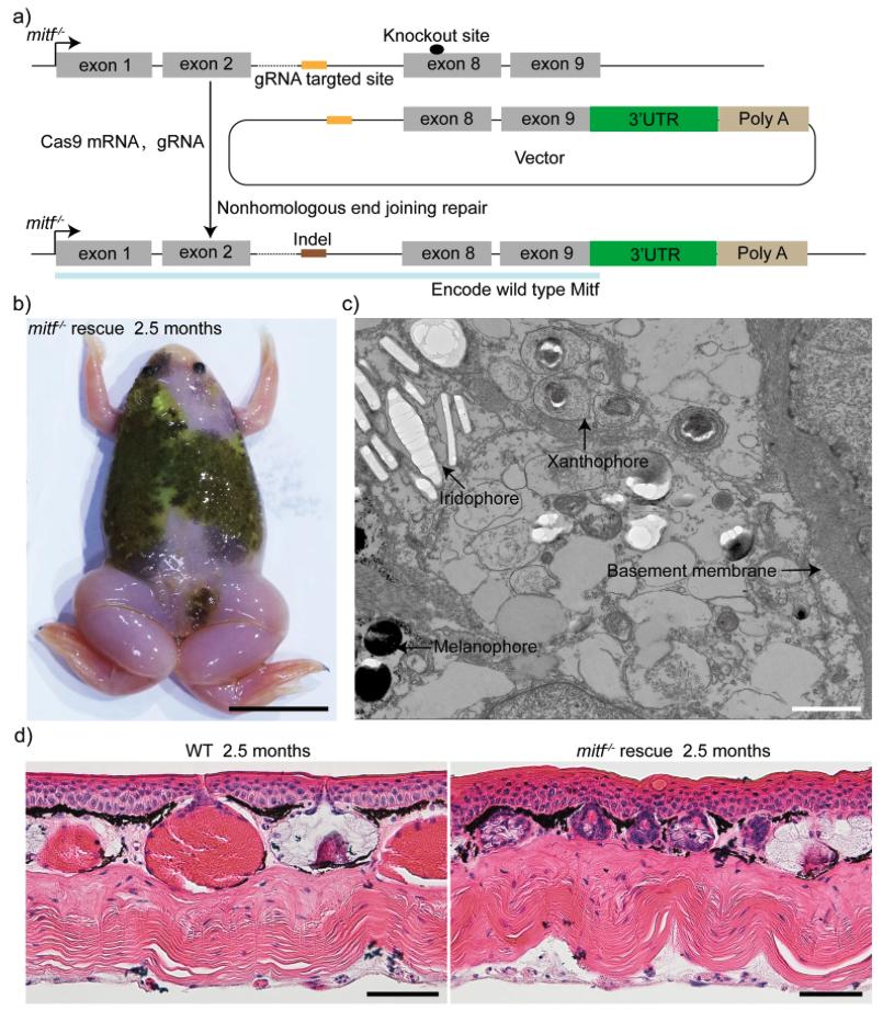 Fig. 11: Schematic of mitf−/−/prkdc−/−/il2rg−/− Xenopus tropicalis construction. The process revealed the crucial role of mitf in the development of melanophores, xanthophores, and granular glands. The resulting mitf−/−/prkdc−/−/il2rg−/− Xenopus tropicalis is suitable for research on allograft tumor transplantation. |