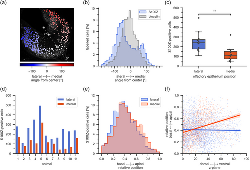 Laterally shifted distribution of S100Z-positive cells. (a) Maximum projection of a larval X. laevis MOE with an overlay of all S100Z-positive cells. The color gradient from blue (lateral) to red (medial) indicates the angular position within the MOE (zero equals the middle of the MOE). Crosses mark the average coordinates of the manually drawn apical and basal MOE boundaries. Angles were determined between each cell position and the vector that defined the middle of the MOE (dashed line). (b) The bimodal distribution of S100Z-positive cells (blue) was shifted toward a lateral position (n = 11 larvae). The general ORN population was labeled via a biocytin backfill and showed a unimodal distribution centered around the middle of the MOE (gray, n = 4 larvae). (c) The mean number of S100Z-positive cells in the lateral MOE was significantly higher than in the medial MOE (n = 11 larvae). KruskalWallis test. **, p < .01. (d) The number of S100Z-positive cells in the lateral MOE was always higher than in the medial MOE in all animals investigated (n = 11 larvae). (e) The relative position within the MOE on the apical-basal axis was not different between the lateral and medial S100Z-positive populations, a tendency toward a more basal position on the lateral side notwithstanding. (f) The medial S100Z-positive population featured a correlation between the position on the ventral-dorsal and basal-apical axis. Cells deeper in the medial MOE were shifted to apical positions. MOE, main olfactory epithelium. |