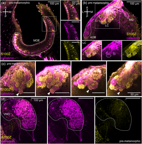 Distinct, but partially overlapping expression patterns of calretinin/S100Z. (a) In premetamorphic X. laevis, ORNs across the whole MOE expressed calretinin (magenta) and S100Z (yellow). Not all but many cells showed co-localization of the two calcium-binding proteins (e.g., white dotted circles). (b) In premetamorphic animals, the axonal projection of calretinin-expressing neurons (magenta) targeted the AOB, LC, and MC. Within the LC, calretinin- and S100Z-positive (yellow) glomeruli were detected and some were double-positive (white dotted ovals). (c) Expression patterns of calretinin (magenta) and S100Z (yellow) in glomeruli of the lateral cluster in four different premetamorphic animals. The expression patterns were very variable between individuals, but some trends for recurring patterns were apparent. The outer lateral glomeruli within the LC had the tendency to be either S100Z- or calretinin-positive (asterisks), whereas in the medial part of the LC, more glomeruli were S100Z-positive. The most caudal glomerulus in the middle of the LC was often double positive for S100Z/calretinin (arrows). (d) Immunohistochemical staining for calretinin (magenta) labeled neurons throughout the whole VNO in premetamorphic animals, but no S100Z expression (yellow) was found in the VNO. A anterior; AOB, accessory olfactory bulb; L, lateral; LC, lateral cluster; M, medial; MC, medial cluster; MOE, main olfactory epithelium; ORN, olfactory receptor neuron; P, posterior; VNO, vomeronasal organ. |