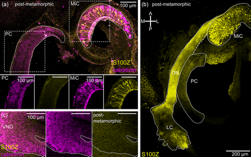 FIGURE 6 S100Z expression restricted to the middle cavity after metamorphosis. (a) In postmetamorphic X. laevis calretinin-positive neurons (magenta) were localized in the middle cavity (MiC) and principal cavity (PC). S100Z expression (yellow) occurred only in ORNs of the MiC. (b) In postmetamorphic animals, S100Z-expressing neurons within the olfactory epithelium of the MiC exclusively projected into the lateral glomerular cluster. No expression of S100Z was found in the PC. (c) Immunohistochemical staining for calretinin (magenta) labeled neurons throughout the whole VNO in postmetamorphic animals. No S100Z expression (yellow) was detected in the VNO. A, anterior; L, lateral; LC, lateral cluster; M, medial; MiC, middle cavity; ON, olfactory nerve; ORN, olfactory receptor neuron; P, posterior; PC, principal cavity; VNO, vomeronasal organ. |