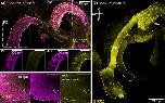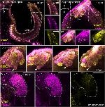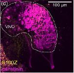 calb2 (calbindin 2m aka calretinin) expression in X. laevis embryo, NF 48/52, assayed via immunohistochemical staining (magenta) showing labeled neurons throughout the whole vomeronasal organ/Jacobsons organ in premetamorphic tadpoles. |