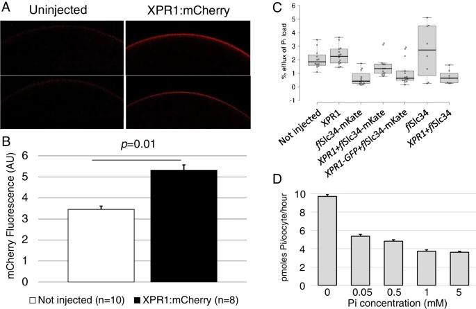 XPR1 is expressed at the membrane of Xenopus oocytes. Various constructs including the flurescent tags mCherry, mKate and GFP were tested with qualitatively comparable results for both localization and efflux of Pi. A mCherry-tagged XPR1 displays enhanced fluorescence (right panel) as compared to non-injected oocytes (left panel). B Quantification of fluorescence in arbitrary units. C Xenopus XPR1 wild type and tagged with fluorescent proteins did not affect Pi efflux from oocytes. D Native oocytes were exposed to varying concentrations of Pi for 24 h followed by measurement of Pi uptake. The reduction of Pi transport to even small increases in Pi in the medium indicates that oocytes have an endogenous system for sensing and responding to environmental Pi