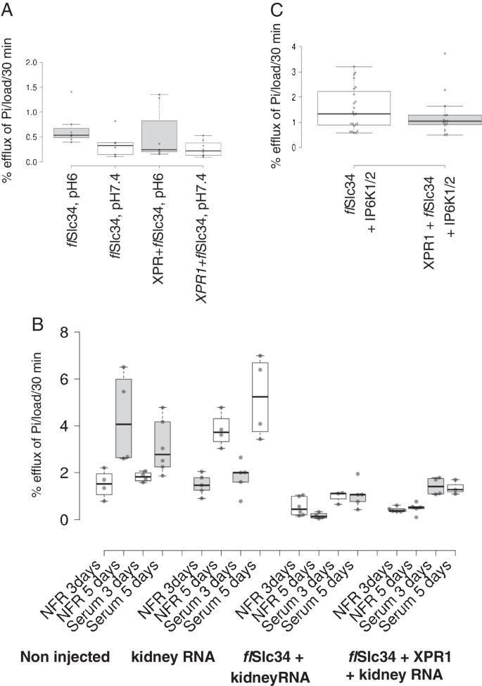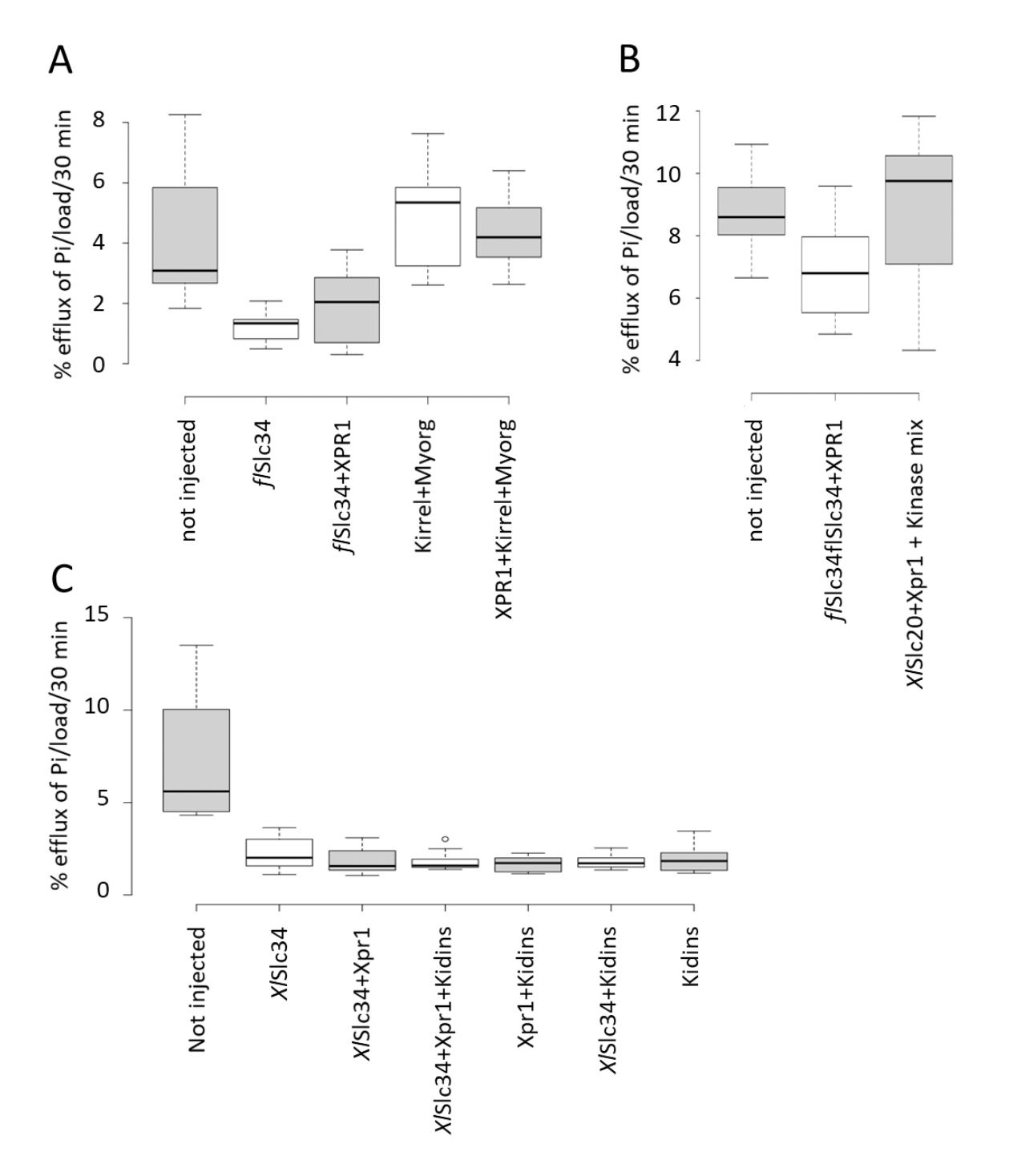 Supplementary Figure 3: Efflux experiments testing different co-factors that potentially stimulate the action of Xpr1. A positive effect of the potential Xpr1 modulators would lead to enhanced Pi export through stimulation of endogenously expressed proteins. Addition of exogenous components such as Slc20, Slc34 or Xpr1 would enhance the signal. Though, stimulation of efflux was not observed. (A) Myorg and Kirrel were tested together but failed to enhance Pi export. (B) A mix of cRNA encoding kinases (IP6K1/2, PPIP5K1/2) was injected. (C) cRNA encoding the Xpr1 cofactor Kidins220 was injected in various combinations with XlSlc34 and Xpr1 and had no effect on Pi export. Experiments were performed twice. Center lines show the medians; box limits indicate the 25th and 75th percentiles; whiskers extend 1.5 times the interquartile range from the 25th and 75th percentiles, an outliers is represented by a dot.