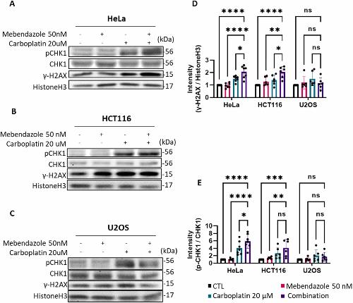 Fig. 6. The combination of mebendazole and carboplatin increases DNA damage response in HeLa and HCT116 cells. (A–C) Western blot analysis of lysates from (A) HeLa, (B) HCT116, or (C) U2OS cells treated with DMSO (CTL), MBZ, carboplatin, or a combination of MBZ and carboplatin under low-serum conditions. pCHK1, CHK1, γ-H2AX, and histoneH3 antibodies were used for the assay. (D) Quantitative analysis of γ-H2AX signals shown in (A). Data were normalized using HistoneH3 as a loading control. Data are shown as fold changes relative to DMSO-treated cells (CTL). Error bars represent mean ± standard deviation. P values were calculated by two-way ANOVA (n = 6). HeLa ****P < 0.0001, ****P < 0.0001, *P = 0.0265. HCT116 ****P < 0.0001, **P = 0.0034, *P = 0.0154. (E) Quantitative analysis of phospho-CHK1 (pCHK1) shown in (C). Data were normalized using CHK1 as a loading control. Data are shown as fold changes relative to DMSO-treated cells (CTL). Error bars represent mean ± standard deviation. P values were calculated by two-way ANOVA (n = 6). HeLa ****P < 0.0001, ****P < 0.0001, *P = 0.0456. HCT116 ***P = 0.0003, **P = 0.0021. |