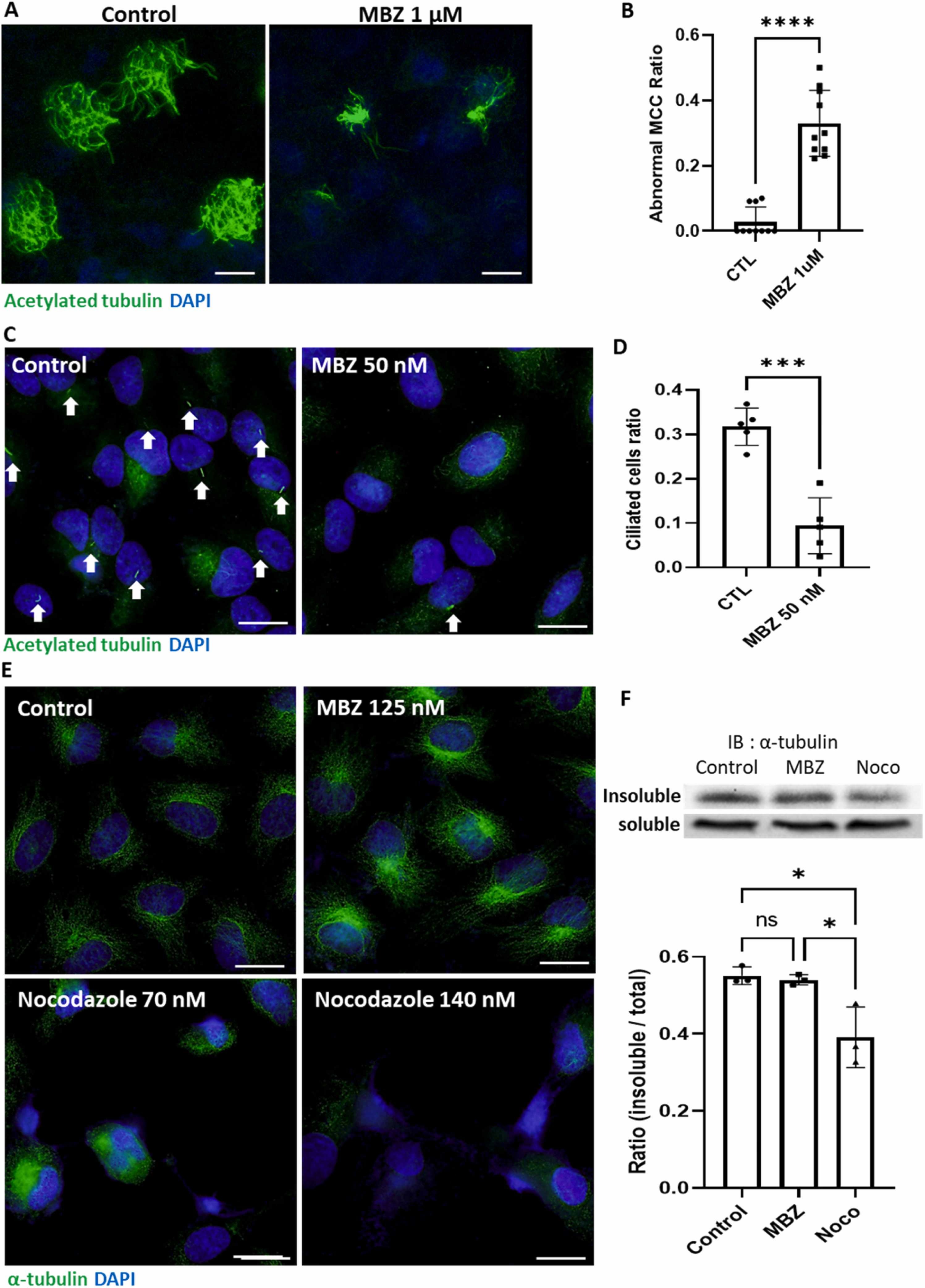 (A) HeLa cells were treated with DMSO (CTL), MBZ, carboplatin, or a combination of MBZ and carboplatin at the indicated concentrations for 48 h under low-serum conditions. Cilia were visualized with anti-acetylated tubulin antibody (green), and nuclei were labeled with DAPI (blue). Scale bar = 10 µm.