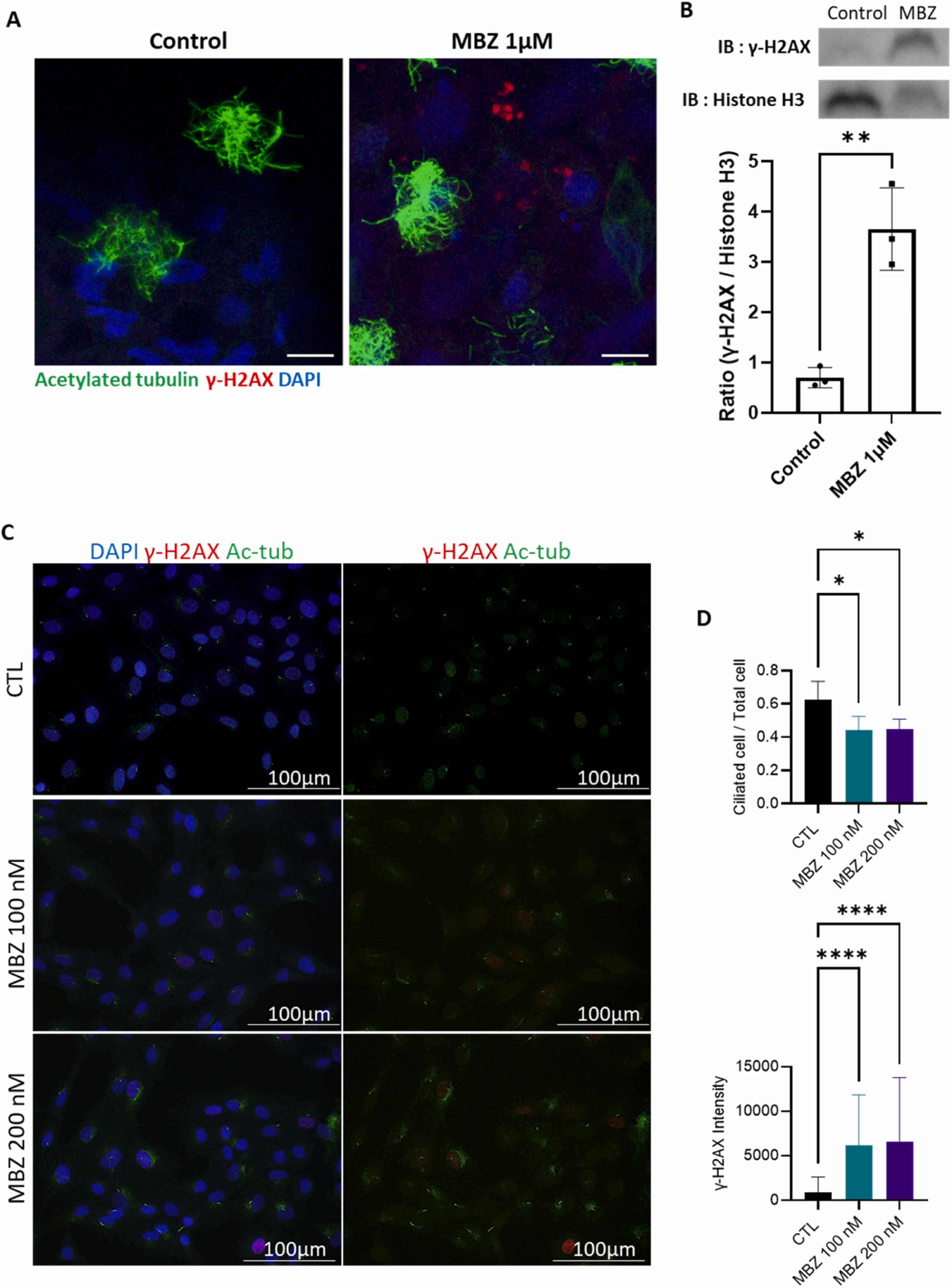 Fig. 3. Mebendazole treatment increased DNA damage in Xenopus laevis embryos and HeLa cells. (A) Xenopus laevis embryos were incubated with MBZ from stage 17 to stage 27 of development. Multicilia on the epidermis were stained with acetylated tubulin (green), and DNA damage foci were stained with an anti-γ-H2AX antibody (red). Scale bars: 10 μm. (B) DNA damage levels in CTL- and MBZ-treated embryos were analyzed by Western blot. Statistical analysis of DNA damage levels was performed. Error bars represent mean ± standard deviation. The p-value was determined by the unpaired student’s t-test (**P = 0.0037, n = 3). (C) HeLa cells were treated with DMSO (CTL) or increasing doses of MBZ (100, 200 nM)for 48 h under low-serum conditions and stained with DAPI (blue) and anti-γ-H2AX antibody (red) for DNA damage visualization. Scale bar = 20 µm. (D) Statistical analysis of ciliated cells and DNA damage levels in CTL- and MBZ-treated cells. Error bars represent mean ± standard deviation. P values were determined by ordinary one-way ANOVA. Ciliated cell/Total cell (*P=0.0154, *P=0.0181, γ-H2AX intensity ****P<0.0001, ****P<0.0001). |