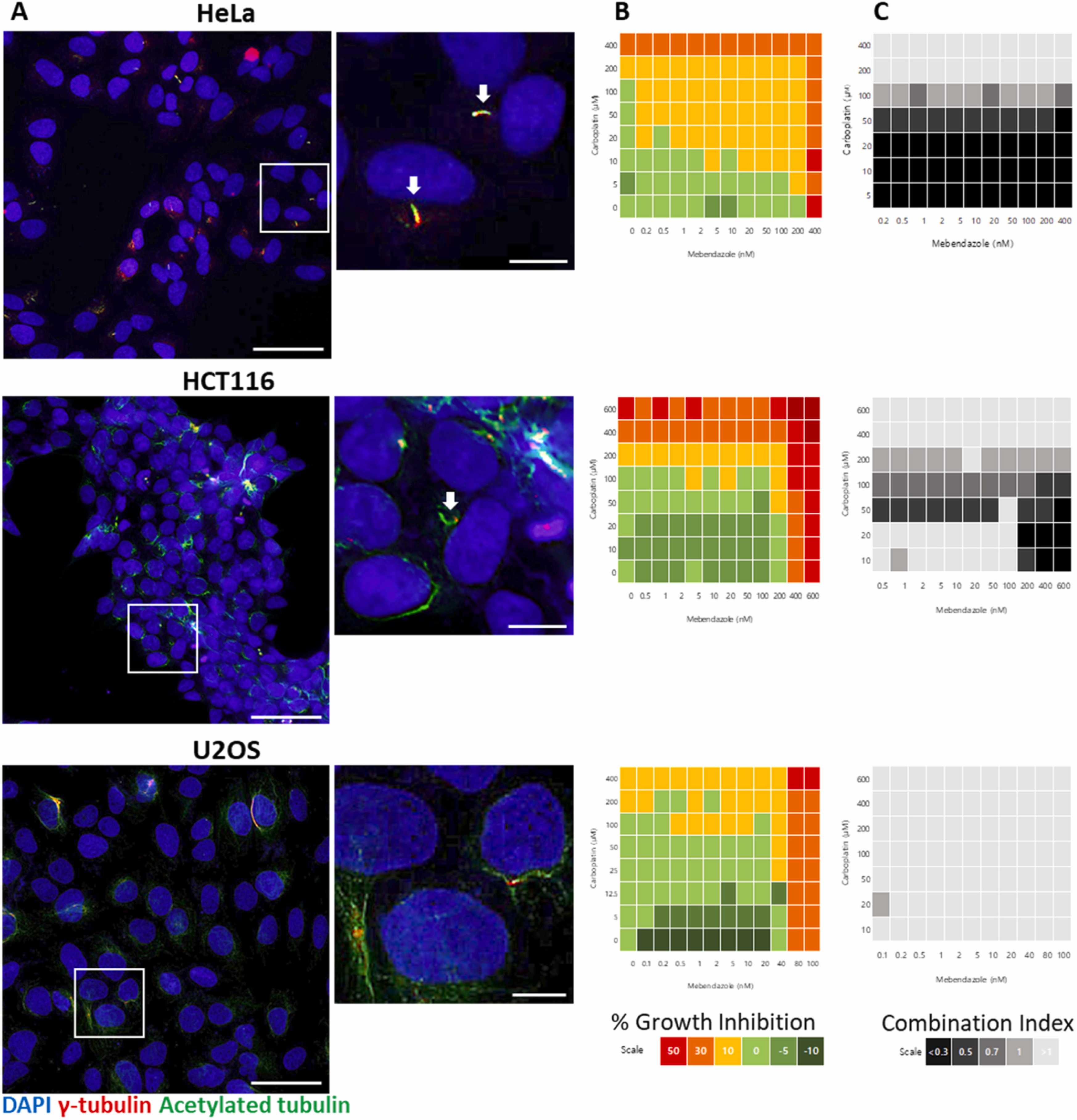Fig. 4. Mebendazole with carboplatin synergistically inhibits cancer cell growth in a primary cilia-dependent manner. (A) HeLa, HCT116, and U2OS cells were incubated for 48 h under low-serum conditions. The primary cilium was labeled with acetylated tubulin (green and white arrows). The basal body/centrosome was labeled with γ-tubulin (red). Nuclei were labeled with DAPI (blue). HeLa cells produce regular primary cilia, whereas HCT116 and U2OS cells produce very short primary cilia and no cilia, respectively. Scale bar (left panel) = 50 µm. Scale bar (right panel) = 10 µm. (B, C) Cells were treated with the indicated combinations of carboplatin and MBZ for 48 h under low-serum conditions. Each plate contained 8 × 12 dose matrix blocks. (B) Percentage growth inhibition was calculated for each drug combination using Synergyfinder. (C) The combination index (CI) was calculated using Compusyn. The percentage-color scale and CI value scale are shown below. |